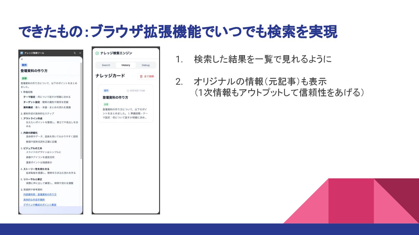 できたもの:ブラウザ拡張機能でいつでも検索を実現 1. 検索した結果を一覧で見れるように 2. オリジナルの情報(元記事)も表示 (1次情報もアウトプットして信頼性をあげる)