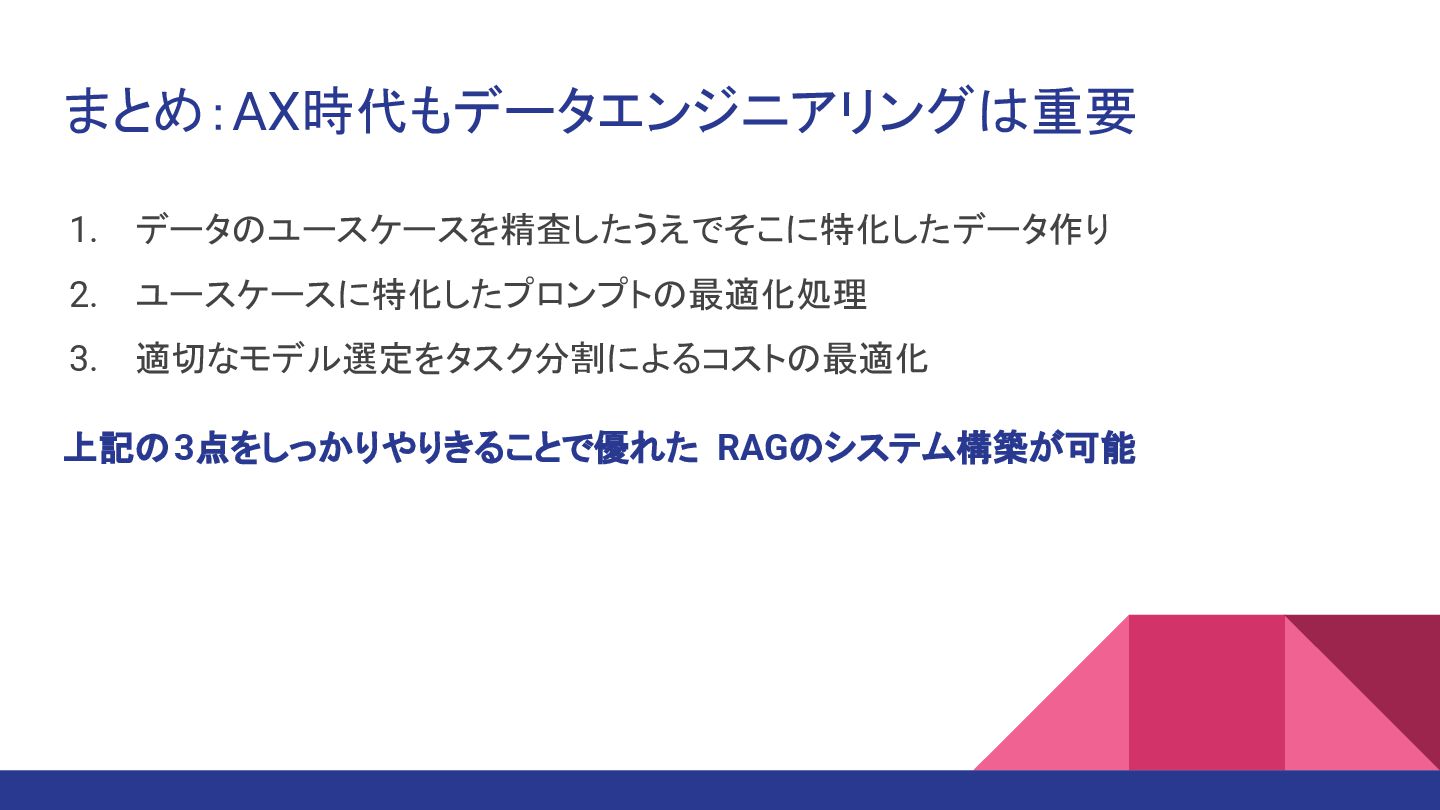 まとめ:AX時代もデータエンジニアリングは重要 1. データのユースケースを精査したうえでそこに特化したデータ作り 2. ユースケースに特化したプロンプトの最適化処理 3. 適切なモデル選定をタスク分割によるコストの最適化 上記の3点をしっかりやりきることで優れた RAGのシステム構築が可能