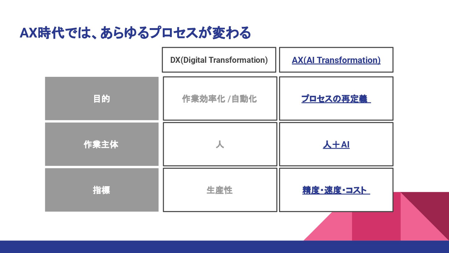 AX時代では、あらゆるプロセスが変わる 目的 作業主体 指標 作業効率化 /自動化 プロセスの再定義 人 生産性 精度・速度・コスト