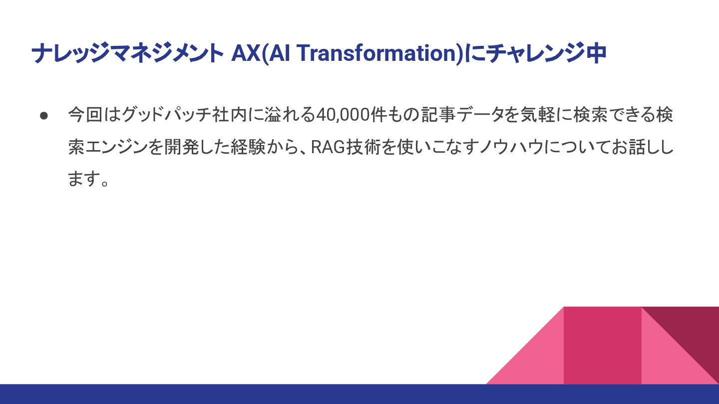ナレッジマネジメント AX(AI Transformation)にチャレンジ中 • 今回はグッドパッチ社内に溢れる40,000件もの記事データを気軽に検索できる検 索エンジンを開発した経験から、RAG技術を使いこなすノウハウについてお話しし ます。