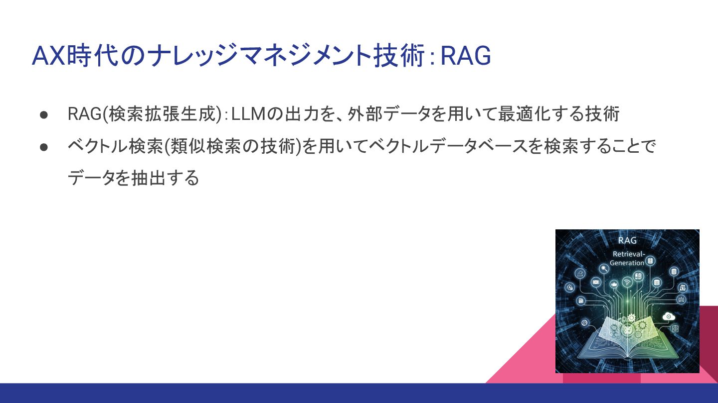 • RAG(検索拡張生成):LLMの出力を、外部データを用いて最適化する技術 • ベクトル検索(類似検索の技術)を用いてベクトルデータベースを検索することで データを抽出する AX時代のナレッジマネジメント技術:RAG