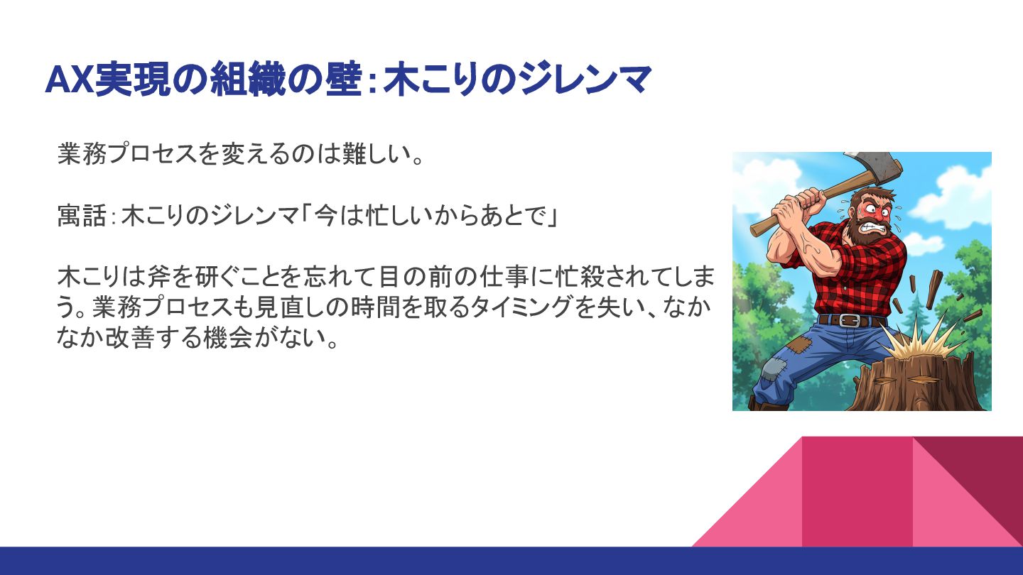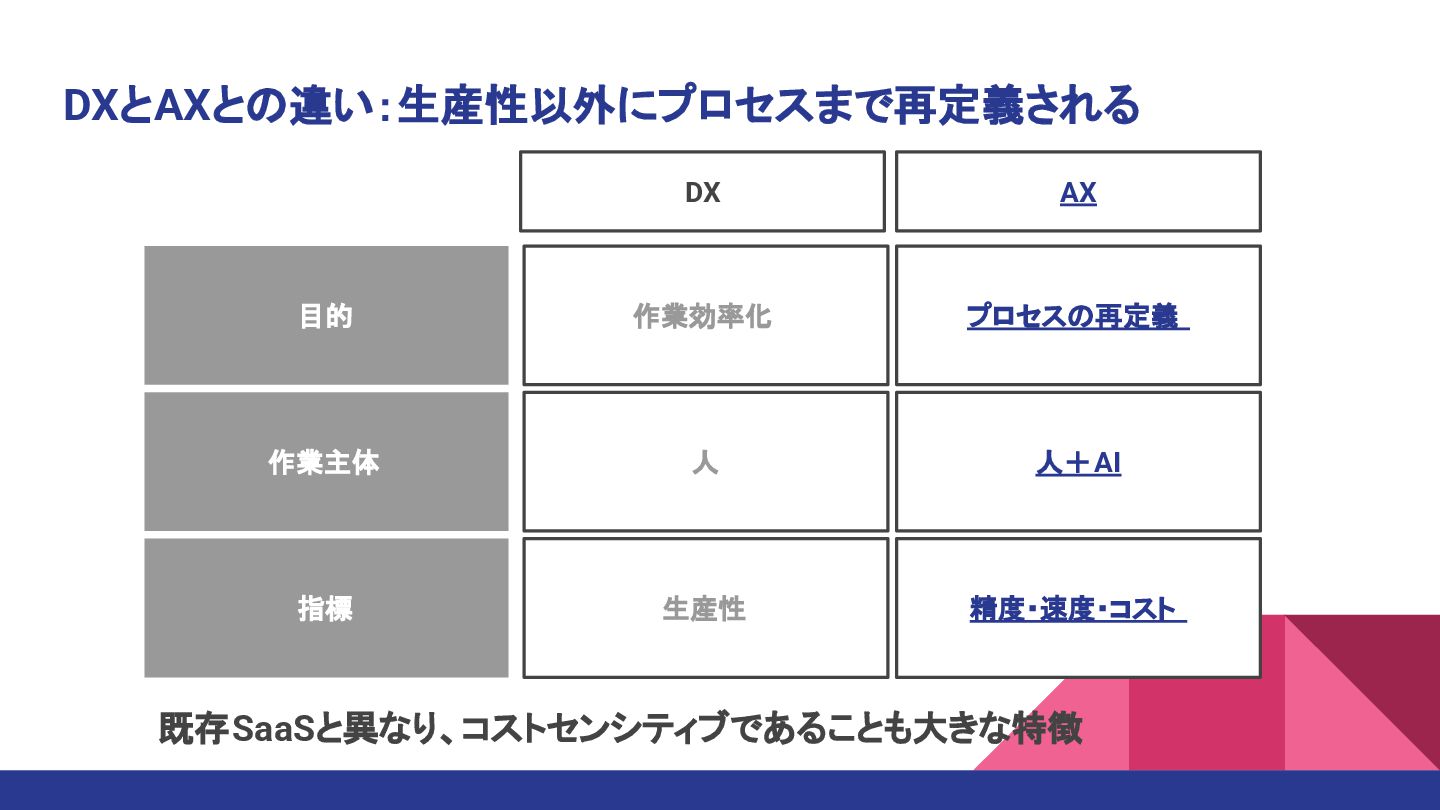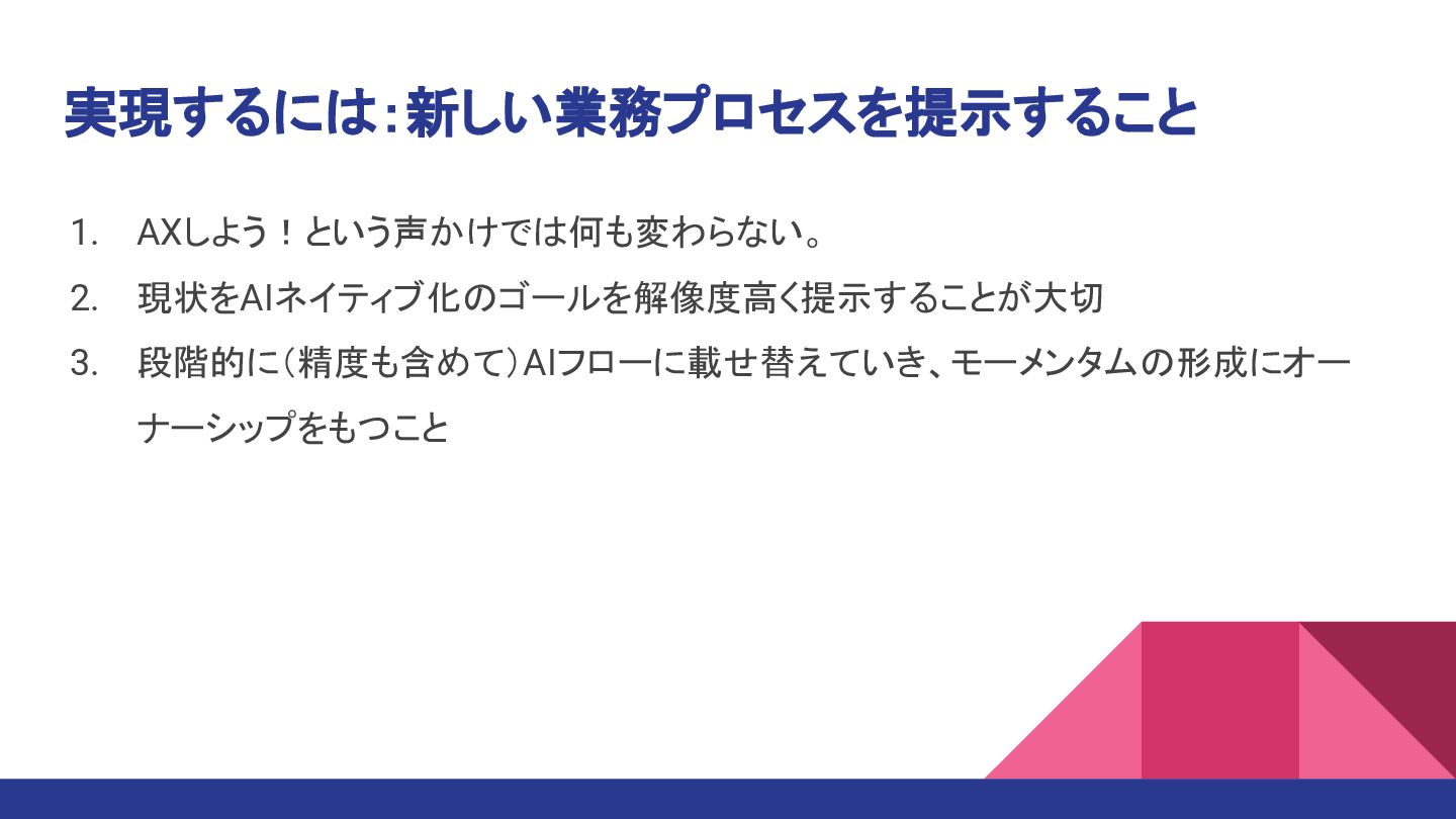 AX 1. AIが:探す 2. AIが:読み込む 3. AIが:わかる 4. AIが:まとめる 5. 人が:確認する 6. 人が:活用する ノ ウ ハ ウ 活 用 1. 人が:メールを探す 2. 人が:メール読み込む 3. 人が:請求書判定する 4. 人が:請求書をダウンロードする 5. 人が:請求書サービスに取り込む メ I ル 請 求 書 取 込 1. AIが:メールを探す 2. AIが:メール読み込む 3. AIが:請求書判定し、ファイル DL 4. 人が:確認する 5. 人が:AIにフィードバックする