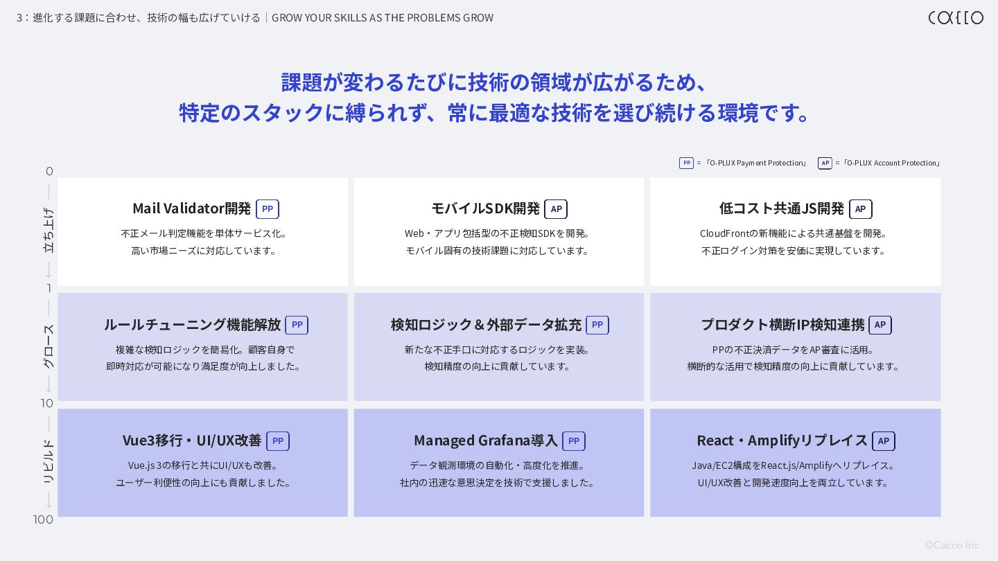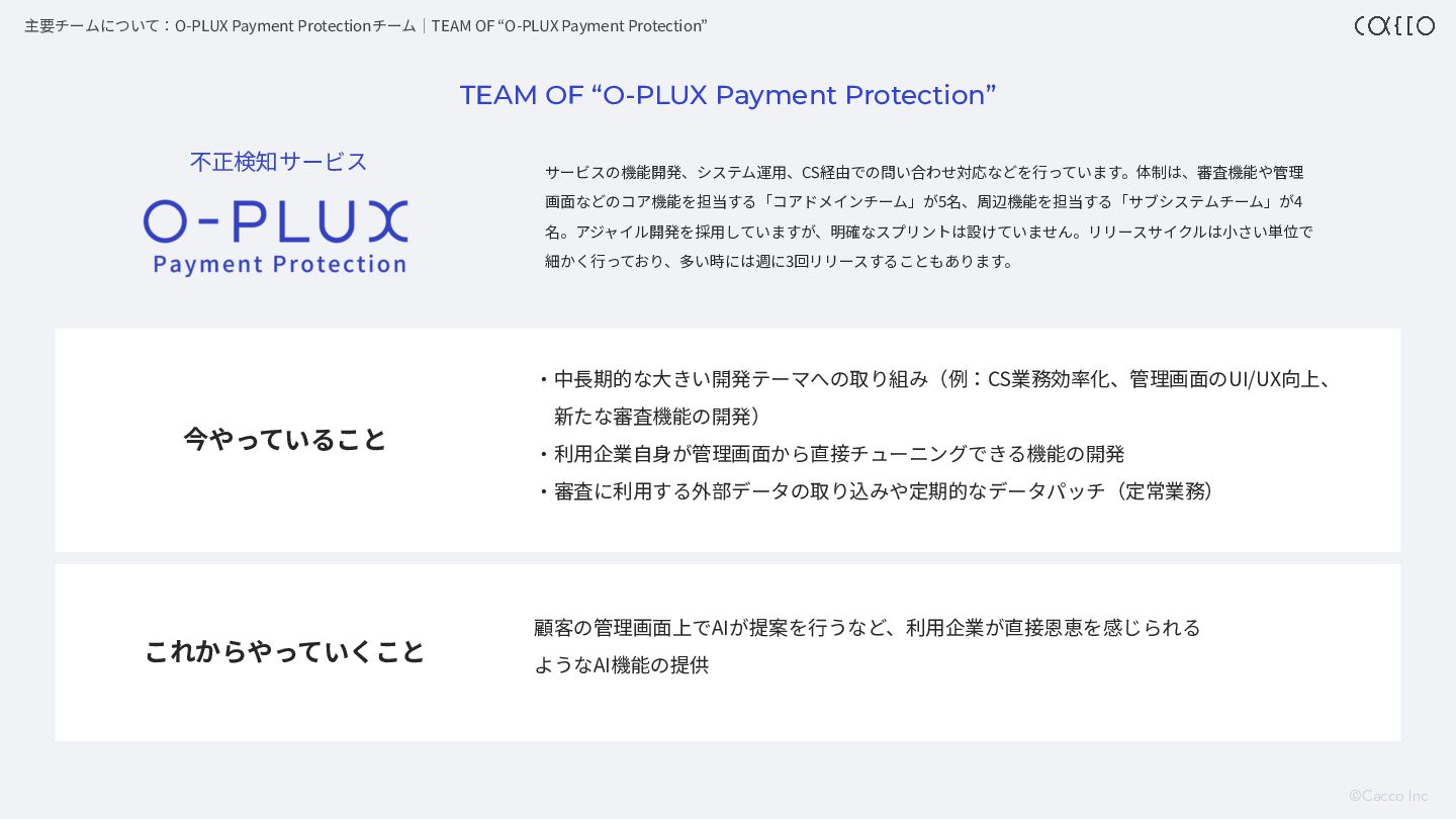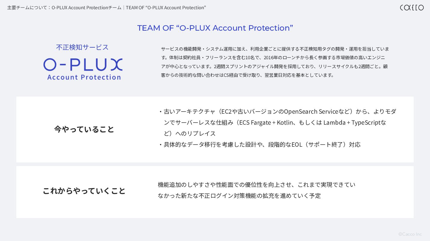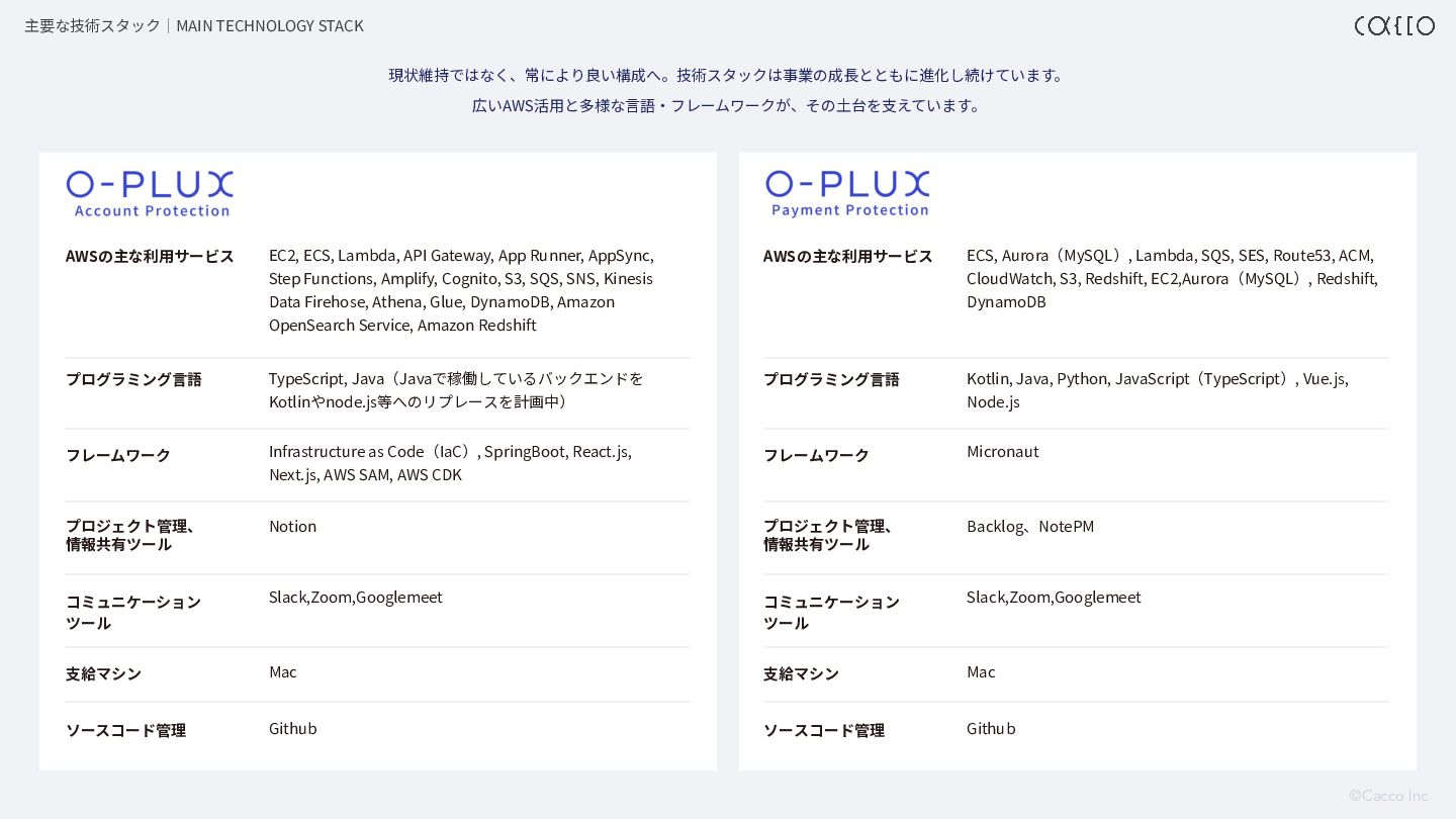 ツール AWSの主な利⽤サービス AWSの主な利⽤サービス EC2, ECS, Lambda, API Gateway, App Runner, AppSync, Step Functions, Amplify, Cognito, S3, SQS, SNS, Kinesis Data Firehose, Athena, Glue, DynamoDB, Amazon OpenSearch Service, Amazon Redshift ECS, Aurora(MySQL), Lambda, SQS, SES, Route53, ACM, CloudWatch, S3, Redshift, EC2,Aurora(MySQL), Redshift, DynamoDB TypeScript, Java(Javaで稼働しているバックエンドを Kotlinやnode.js等へのリプレースを計画中) Kotlin, Java, Python, JavaScript(TypeScript), Vue.js, Node.js Infrastructure as Code(IaC), SpringBoot, React.js, Next.js, AWS SAM, AWS CDK Micronaut Slack,Zoom,Googlemeet Slack,Zoom,Googlemeet Mac Mac Github Github Notion Backlog、NotePM プログラミング⾔語 プログラミング⾔語 フレームワーク フレームワーク プロジェクト管理、 情報共有ツール プロジェクト管理、 情報共有ツール ⽀給マシン ⽀給マシン ソースコード管理 ソースコード管理