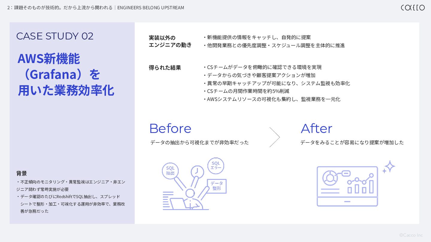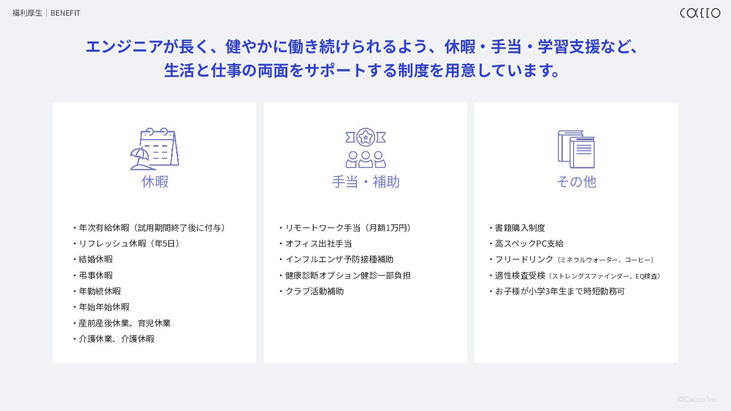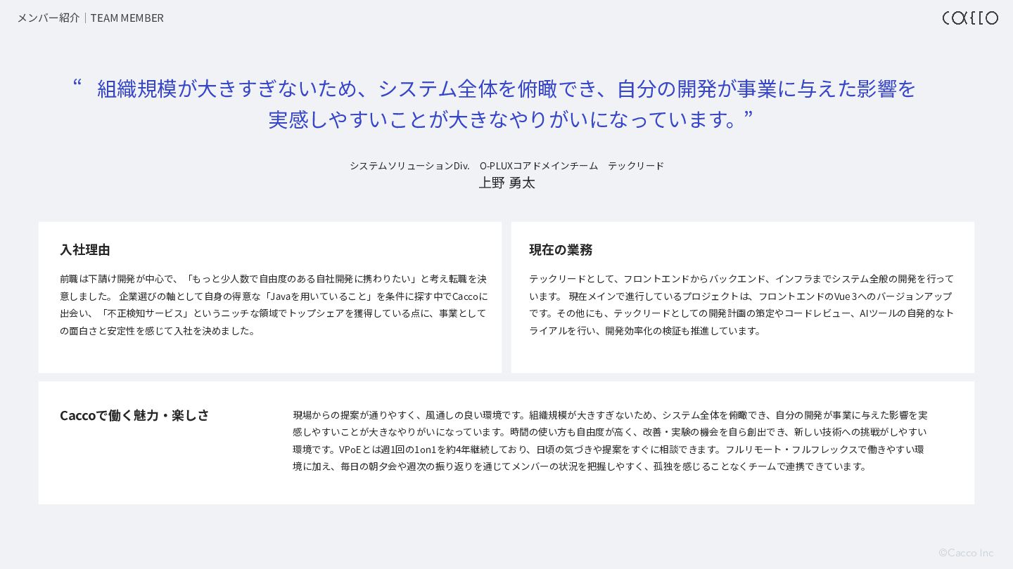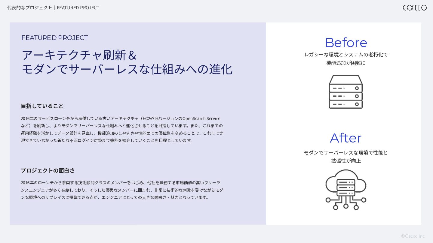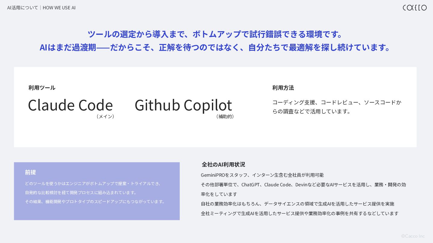 ツール AWSの主な利⽤サービス AWSの主な利⽤サービス EC2, ECS, Lambda, API Gateway, App Runner, AppSync, Step Functions, Amplify, Cognito, S3, SQS, SNS, Kinesis Data Firehose, Athena, Glue, DynamoDB, Amazon OpenSearch Service, Amazon Redshift ECS, Aurora(MySQL), Lambda, SQS, SES, Route53, ACM, CloudWatch, S3, Redshift, EC2,Aurora(MySQL), Redshift, DynamoDB TypeScript, Java(Javaで稼働しているバックエンドを Kotlinやnode.js等へのリプレースを計画中) Kotlin, Java, Python, JavaScript(TypeScript), Vue.js, Node.js Infrastructure as Code(IaC), SpringBoot, React.js, Next.js, AWS SAM, AWS CDK Micronaut Slack,Zoom,Googlemeet Slack,Zoom,Googlemeet Mac Mac Github Github Notion Backlog、NotePM プログラミング⾔語 プログラミング⾔語 フレームワーク フレームワーク プロジェクト管理、 情報共有ツール プロジェクト管理、 情報共有ツール ⽀給マシン ⽀給マシン ソースコード管理 ソースコード管理