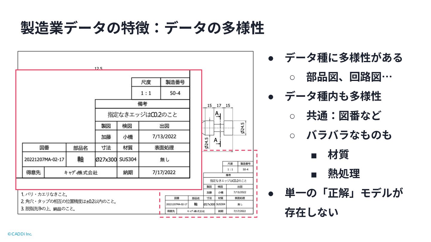 7. © CADDi Inc. 製造業データの特徴:データの多様性 • データ種に多様性がある ◦ 部品図、回路図… • データ種内も多様性