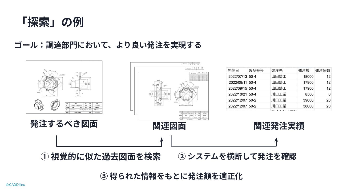 データに基づく 意思決定 繰り返し • CADDi Drawer が⽬指すもの ◦ 意思決定の質を上げる ◦ データに基づく意思決定 • 不定形な探索が重要 ◦ どんなデータが必要? ◦ どうやったら⾒つかる? ◦ → 初めはわからない