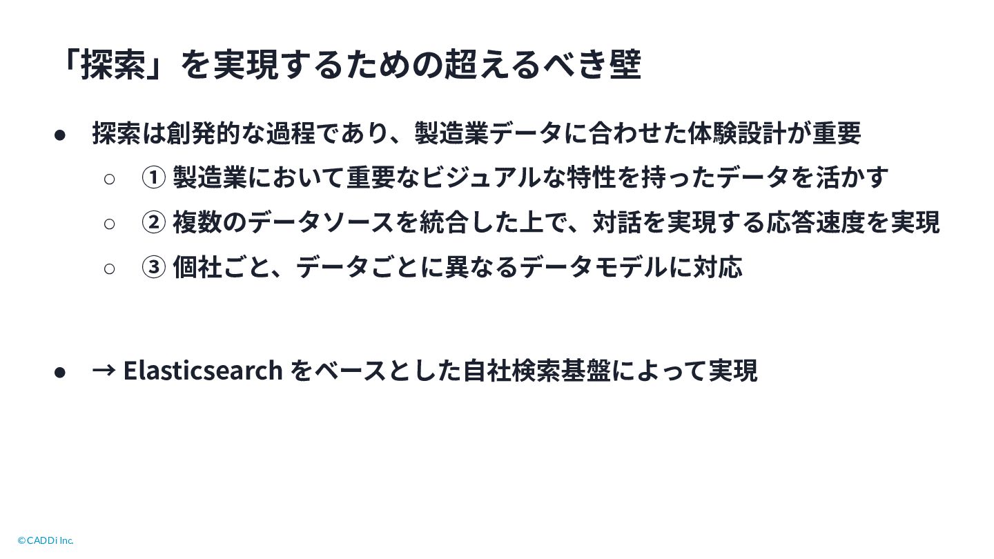 10. © CADDi Inc. 「探索」を実現するための超えるべき壁 • 探索は創発的な過程であり、製造業データに合わせた体験設計が重要 ◦ ① 製造業において重要なビジュアルな特性を持ったデータを活かす ◦