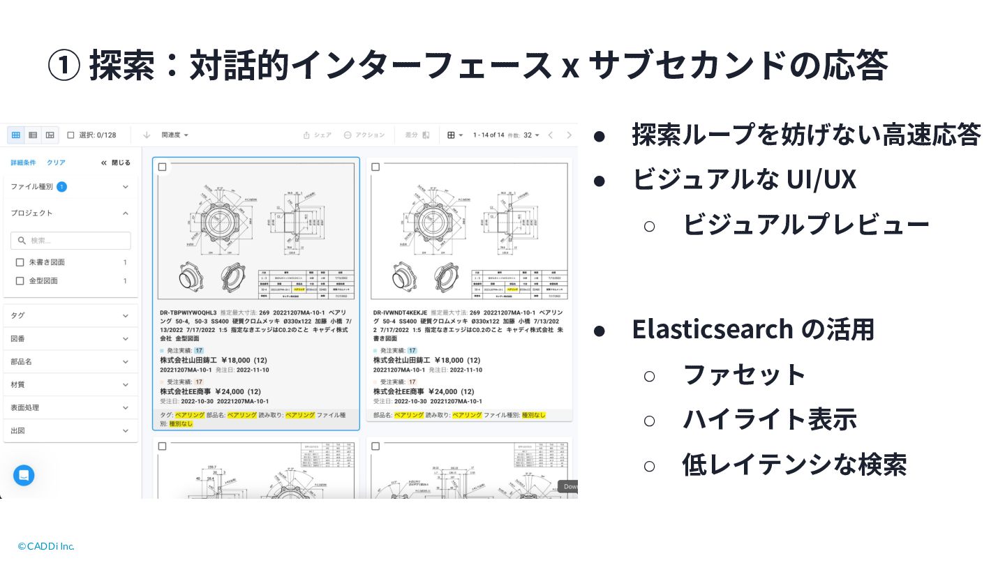 11. © CADDi Inc. ① 探索:対話的インターフェース x サブセカンドの応答 • 探索ループを妨げない⾼速応答 •