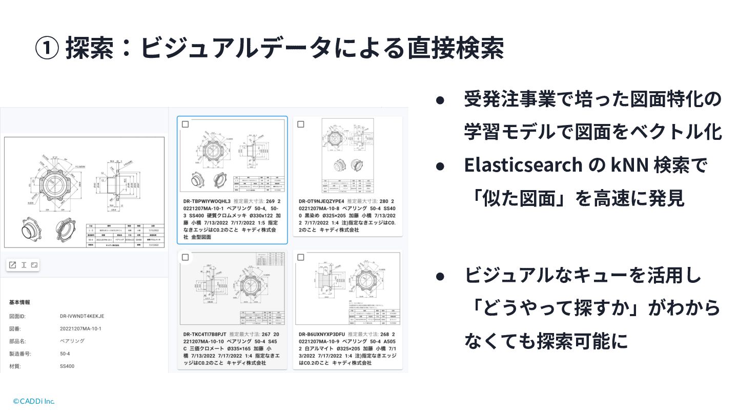 12. © CADDi Inc. ① 探索:ビジュアルデータによる直接検索 • 受発注事業で培った図⾯特化の 学習モデルで図⾯をベクトル化 • Elasticsearch