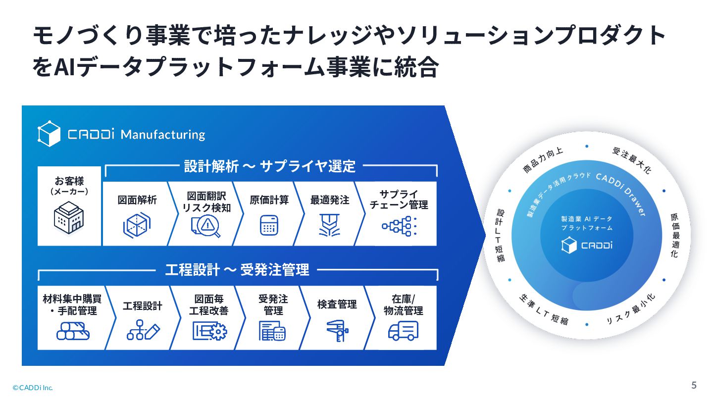 3. © CADDi Inc. モノづくり事業で培ったナレッジやソリューションプロダクト をAIデータプラットフォーム事業に統合 5 図⾯解析 図⾯翻訳 リスク検知 原価計算