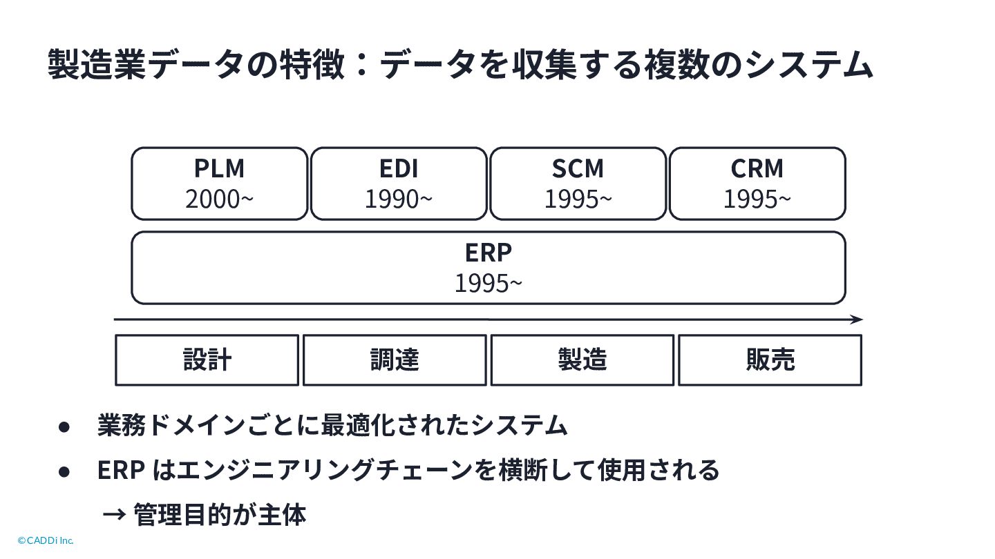 PLM 2000~ EDI 1990~ SCM 1995~ CRM 1995~ • 業務ドメインごとに最適化されたシステム • ERP はエンジニアリングチェーンを横断して使⽤される → 管理⽬的が主体