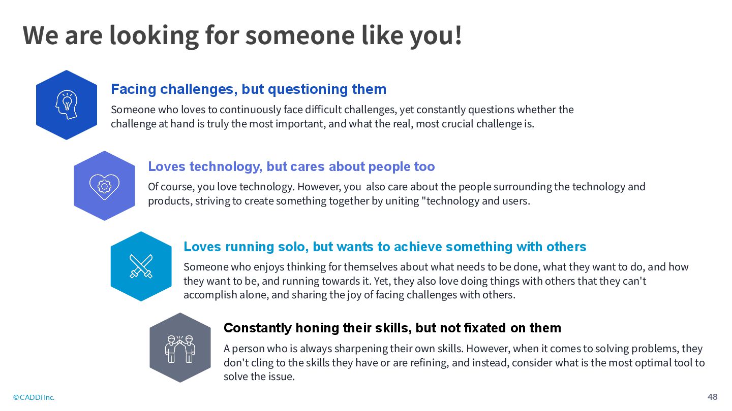 OGIS Research Institute in Silicon Valley, engaging in collaborative development projects with local startups. After returning to Japan, he completed his master's degree in Intelligent Creative Systems at Kanazawa Institute of Technology. Joined Sansan in 2009 and became Executive Officer and CTO in 2019. Joined NTT Laboratories in 2015. From 2018, served as Executive Officer and CTO at a startup focused on manufacturing management IoT SaaS. After joining CADDi, he established the AI Lab and led product management. Currently, he leads the Data & Analysis division. After working at BizReach and M3, joined CADDi in September 2022. Initially involved in the development of supply chain management products, gradually shifted focus to Engineering Manager, currently responsible for the organization’s technical strategy and management of the Enabling organization at the CTO Office. Stanford University Graduate School, majoring in Electrical Engineering. Worked at an aircraft and spacecraft development company in the U.S. during his studies. Later led product development and factory audits for products like the iPhone and AirPods at Apple’s U.S. headquarters. Served at OGIS Research Institute in Silicon Valley, engaging in collaborative development projects with local startups. After returning to Japan, he completed his master's degree in Intelligent Creative Systems at Kanazawa Institute of Technology. Joined Sansan in 2009 and became Executive Officer and CTO in 2019. Engaged in research and development of robot vision at Canon and automotive camera image recognition at Denso. Later, worked at Exawizards as Tech Lead of the Machine Learning Vision Group, gaining experience in various PoC developments. Kaggle Master. After working at Stockmark and DMM.com, joined CADDi in November 2022 as an ML Engineer, focusing on drawing analysis. Since July 2023, he has been managing MLOps, working to build a re-learning infrastructure for continuous updates of ML models. Kaggle Grandmaster. Started at an advertising agency as a new graduate, then transitioned to DeNA as a data scientist. Worked on demand-supply prediction models for the automotive business and recommendation models for live streaming services. Kaggle Master. Joined DeNA in 2019, working on the recommendation system for the live broadcast platform and participating in a fuel scheduling project for power plants. Joined CADDi in March 2022, working on data infrastructure development after serving as MLE and PdM. Has a background in machine learning. After developing an e-book reader using browser technology at a planning-based software company, he served as CTO at a healthcare DX startup before joining CADDi. Currently involved in managing the ML team. After working for three contract development companies, joined Sansan in 2014, participating in the development of "Sansan," serving as an engineer, tech lead, and development manager. Later also served as deputy manager of data strategy. Joined CADDi in April 2024, focusing on managing the Growth organization. Aki Kobashi CTO Shigemoto Fujikura Drawer VP of Engineering Takeaki Imai Technical Product Manager, Engineering Manager Jumpei Nishina Engineering Manager Masaki Inaba ML Engineer / Manager Yuya Osujo ML Engineer Masaki Yano ML R&D Atsushi Kambara Engineering Manager Amane Suzuki Data Engineer Shunsuke Takei Engineering Manager Engineering Manager Masaaki Sugiura Has served as a project manager at Simplex and later joined Talknote as CTO, contributing to service expansion. Joined Userbase in 2014, became CTO of NewsPicks in 2016, and later CTO of Uzabase USA. Joined CADDi in September 2024. Yusuke Komori After working at an IT consulting firm, joined LINE in 2019, leading the development of new services. Joined CADDi in February 2022, involved in cross-company technical problem-solving and the development and operation of authentication and authorization infrastructure. Authored "Revised Edition: Introduction to Web Technologies for Professionals" in 2024. Software Engineer