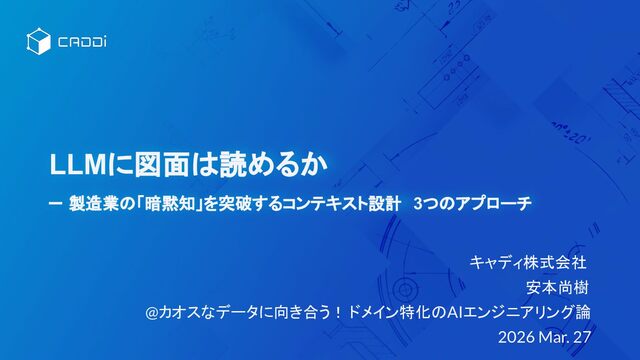 LLMに図面 読めるか – 製造業 「暗黙知」を突破するコンテキスト設計 3つ アプローチ キャディ株式会社 安本尚樹 @カオスなデータに向き合う!
