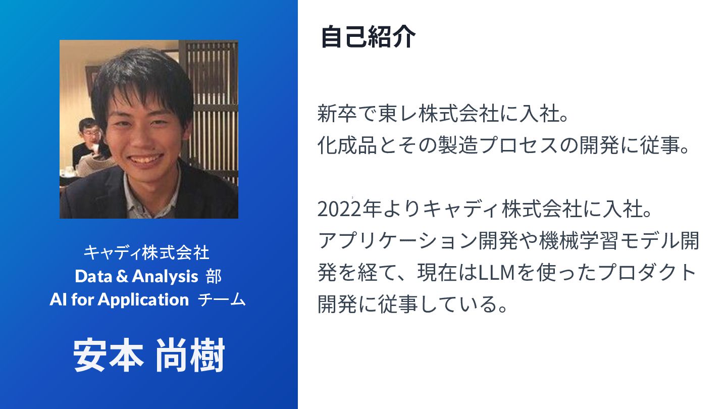 チーム 安本 尚樹 新卒で東レ株式会社に⼊社。 化成品とその製造プロセスの開発に従事。 2022年よりキャディ株式会社に⼊社。 アプリケーション開発や機械学習モデル開 発を経て、現在はLLMを使ったプロダクト 開発に従事している。 ⾃⼰紹介