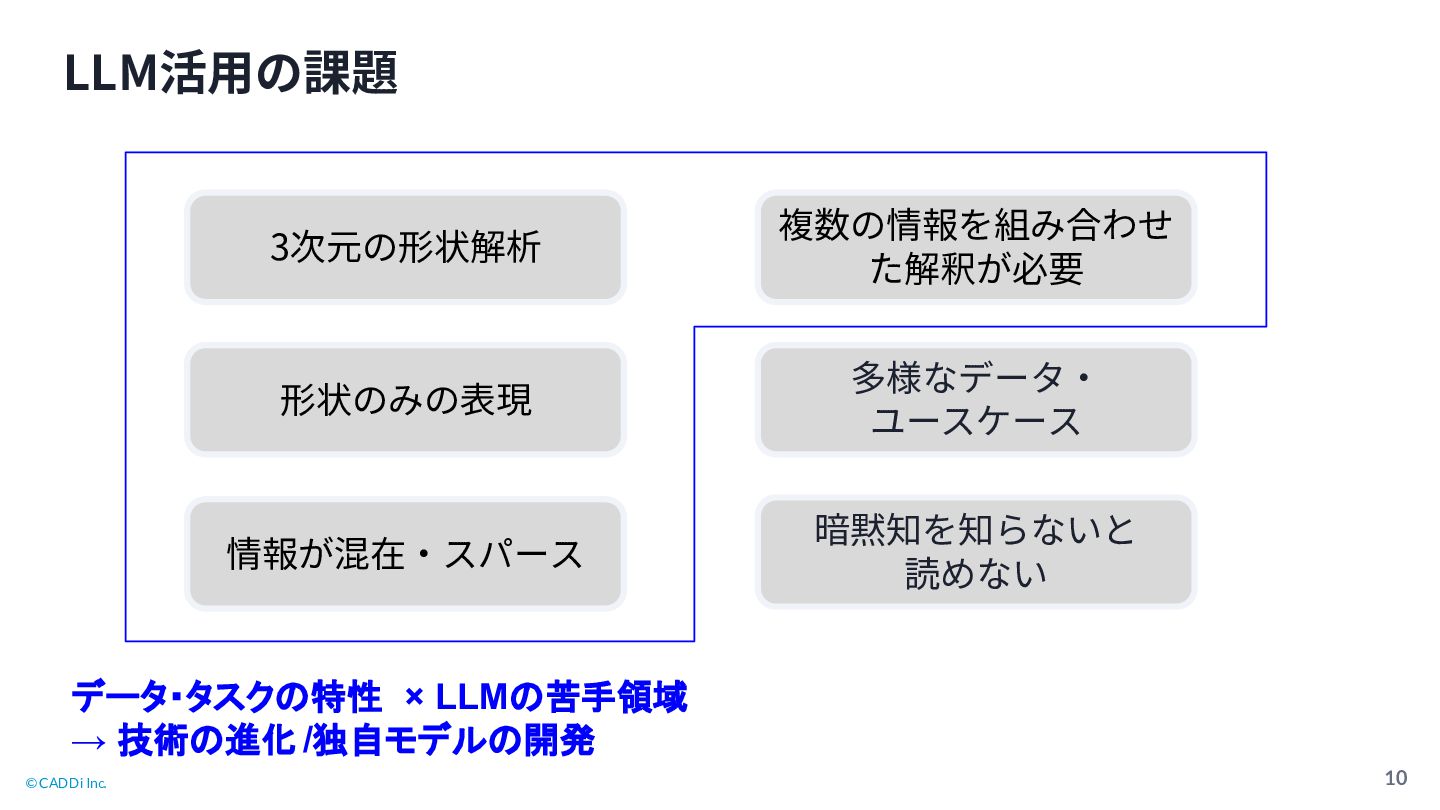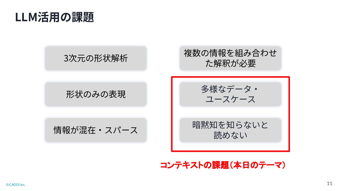 © CADDi Inc. 10 LLM活⽤の課題 暗黙知を知らないと 読めない 多様なデータ‧ ユースケース 形状のみの表現