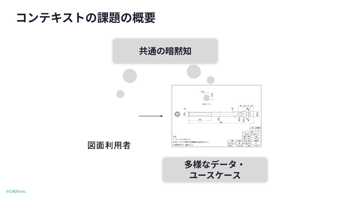© CADDi Inc. コンテキストの課題の概要 共通の暗黙知 多様なデータ‧ ユースケース 図面利用者