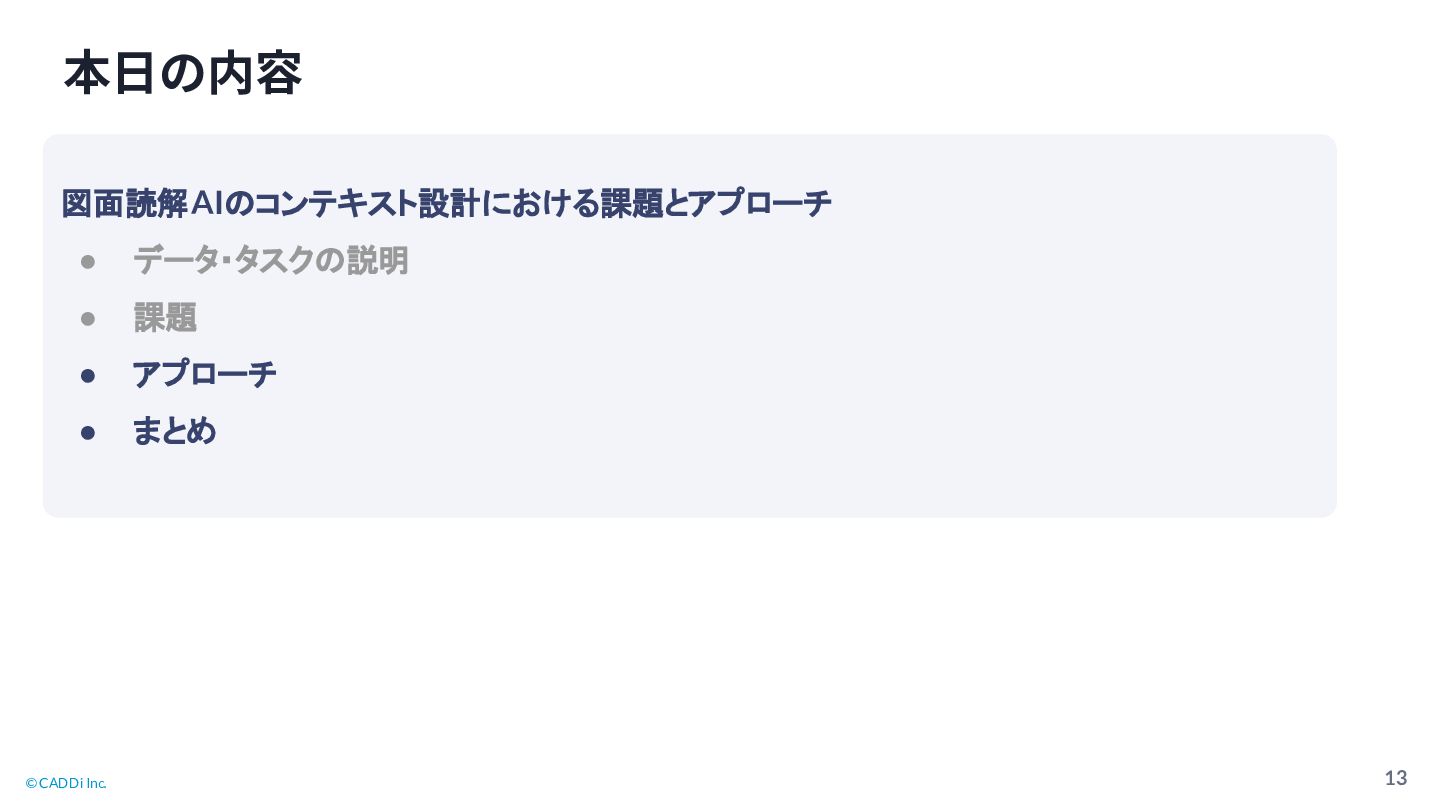 © CADDi Inc. 13 本⽇の内容 図面読解AI コンテキスト設計における課題とアプローチ • データ・タスク 説明