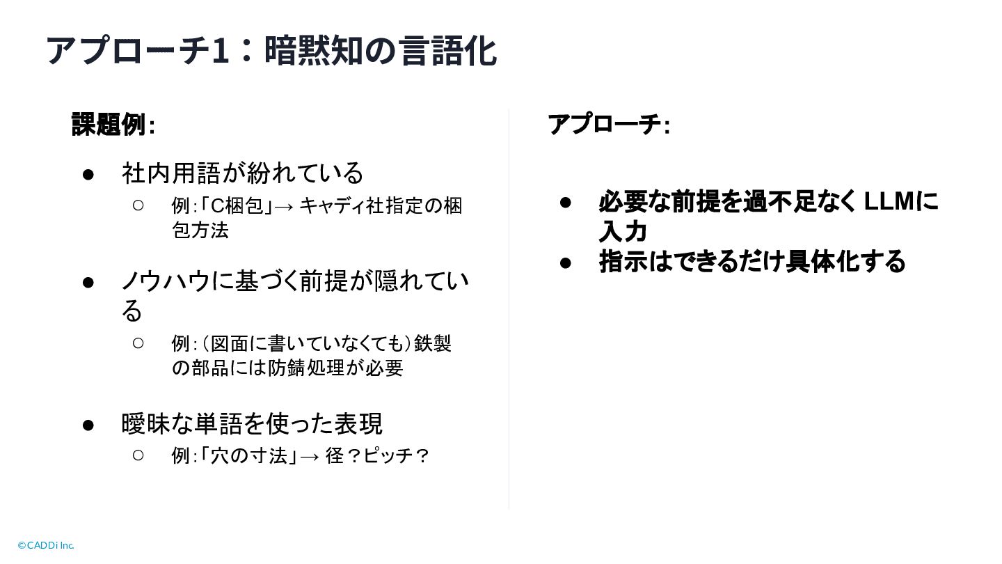 キャディ社指定 梱 包方法 • ノウハウに基づく前提が隠れてい る ◦ 例:(図面に書いていなくても)鉄製 部品に 防錆処理が必要 • 曖昧な単語を使った表現 ◦ 例:「穴 寸法」→ 径?ピッチ? • 必要な前提を過不足なく LLMに 入力 • 指示 できるだけ具体化する