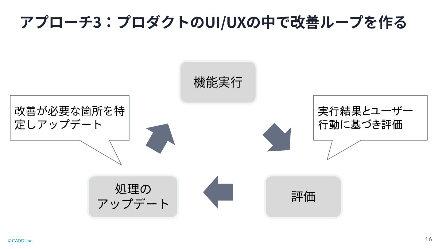 © CADDi Inc. 16 アプローチ3:プロダクトのUI/UXの中で改善ループを作る 機能実⾏ 処理の アップデート 評価 改善が必要な箇所を特