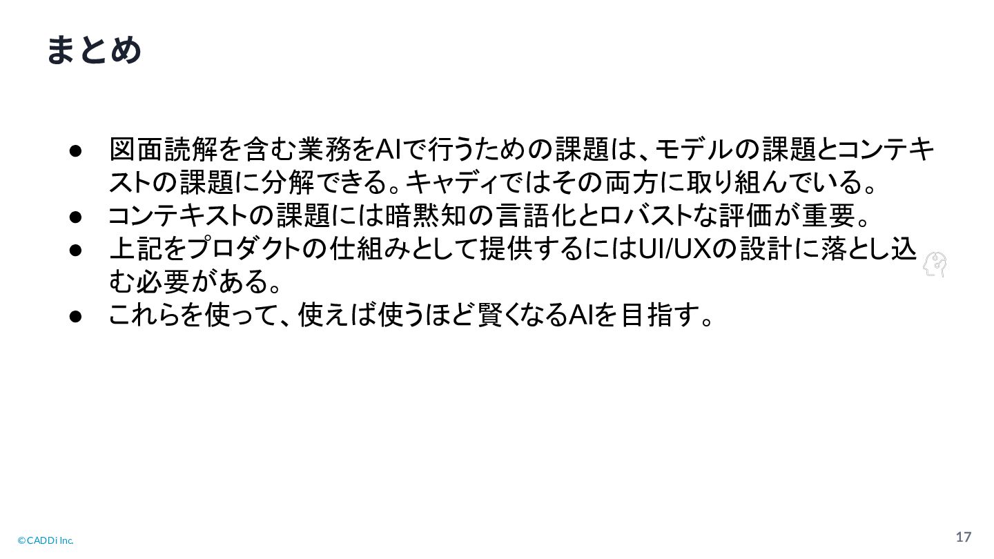 © CADDi Inc. 17 まとめ • 図面読解を含む業務をAIで行うため 課題 、モデル 課題とコンテキ