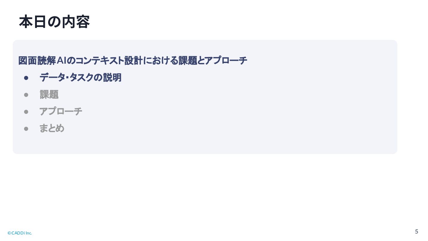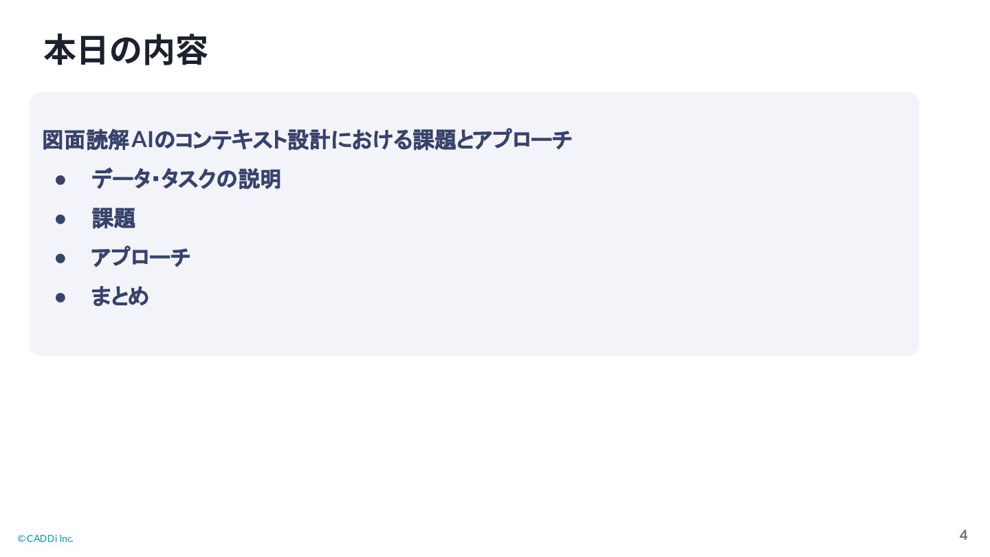 © CADDi Inc. 4 本⽇の内容 図面読解AI コンテキスト設計における課題とアプローチ • データ・タスク 説明