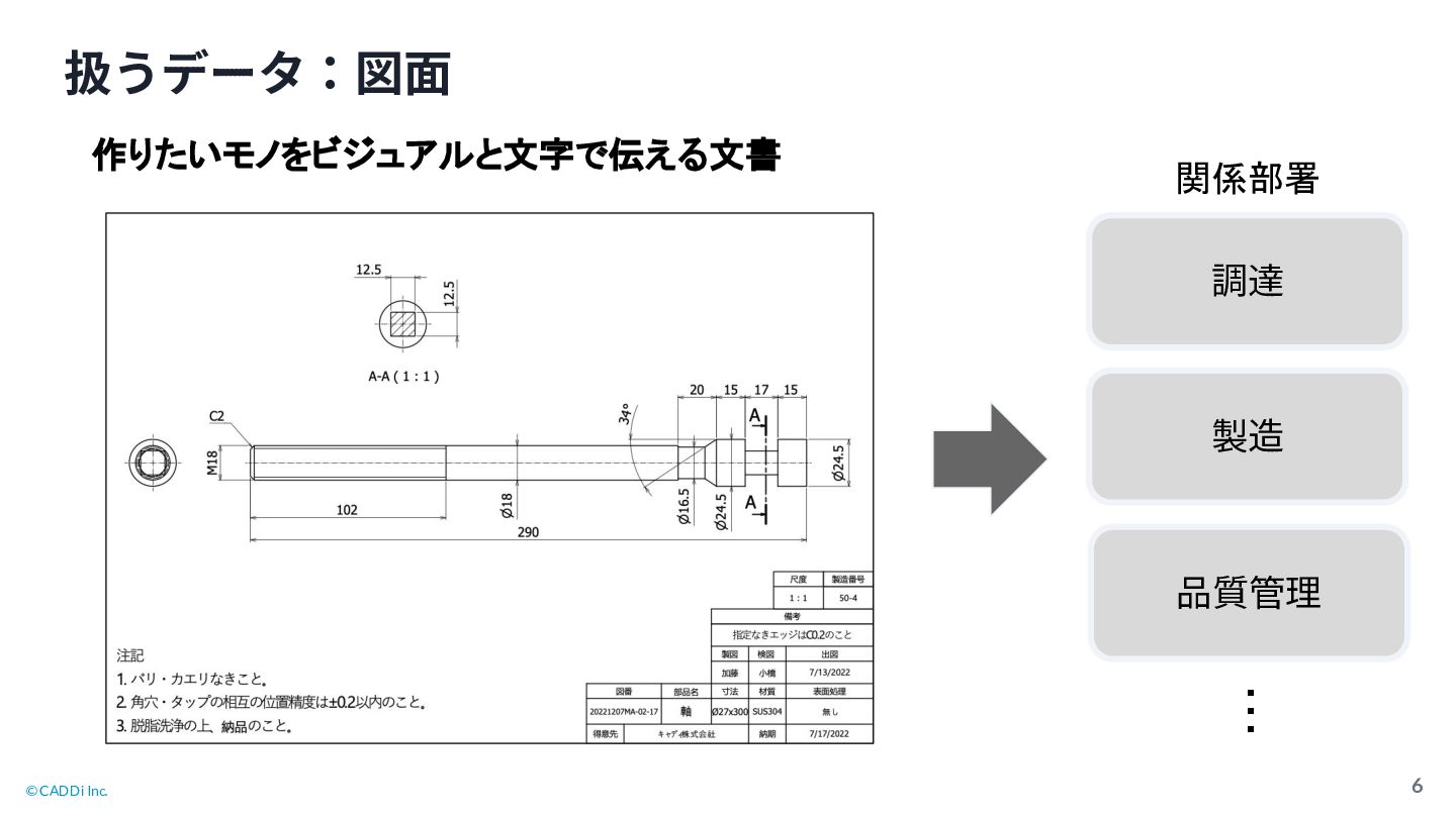 © CADDi Inc. 6 扱うデータ:図⾯ 作りたいモノをビジュアルと文字で伝える文書 製造 調達 品質管理 ・・・