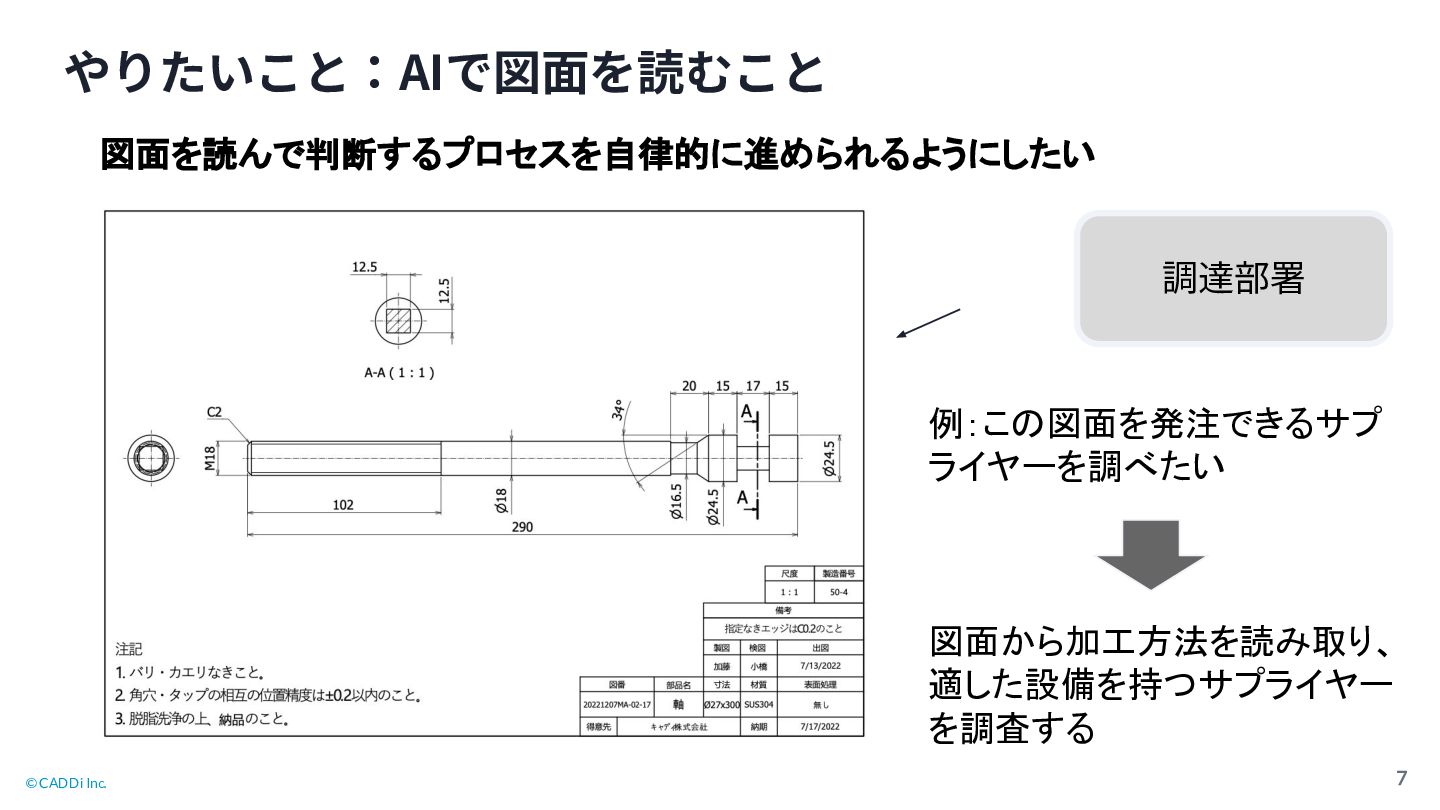 © CADDi Inc. 7 図面を読んで判断するプロセスを自律的に進められるようにしたい やりたいこと:AIで図⾯を読むこと 例:こ 図面を発注できるサプ ライヤーを調べたい 図面から加工方法を読み取り、
