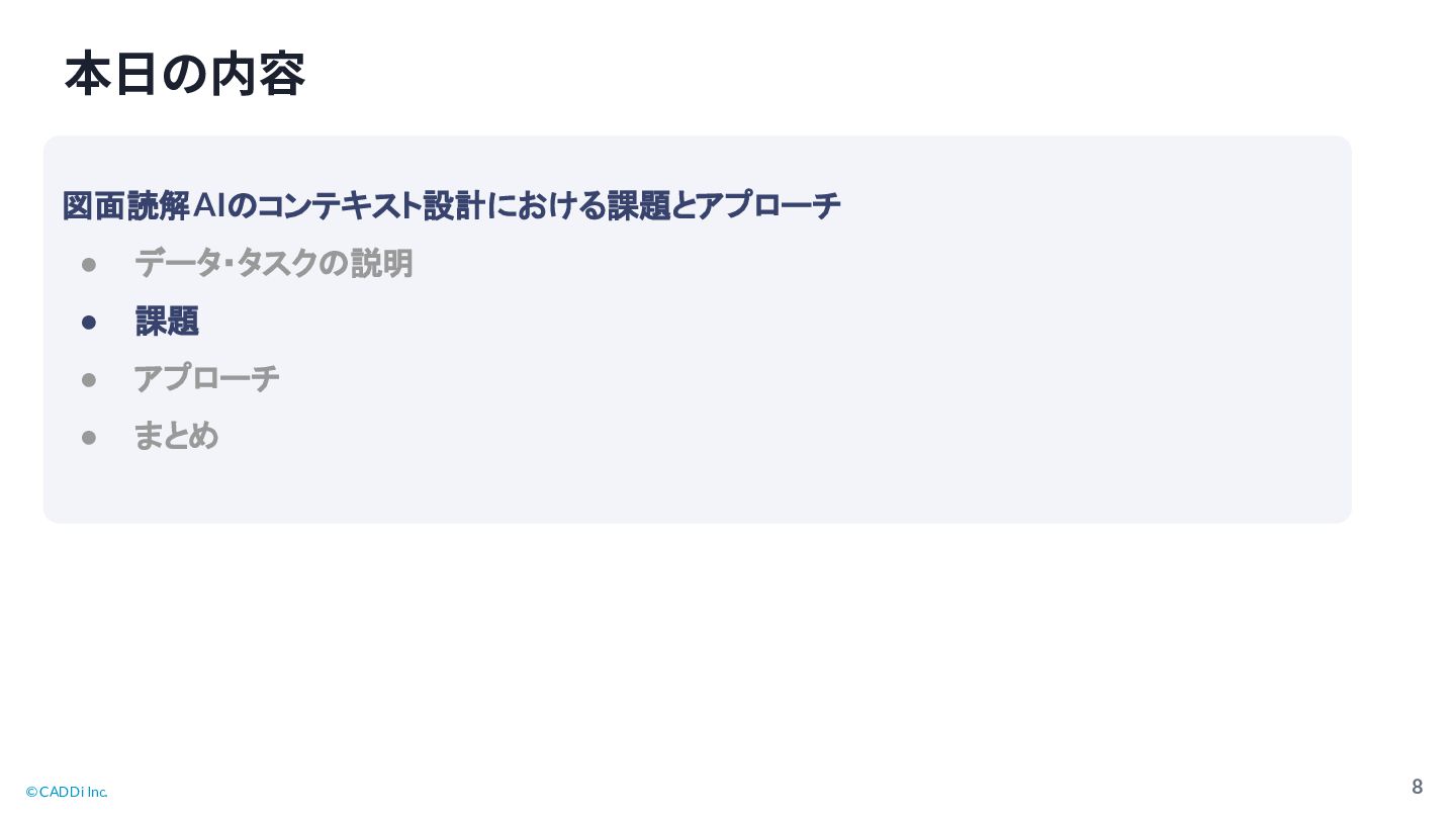 © CADDi Inc. 8 本⽇の内容 図面読解AI コンテキスト設計における課題とアプローチ • データ・タスク 説明