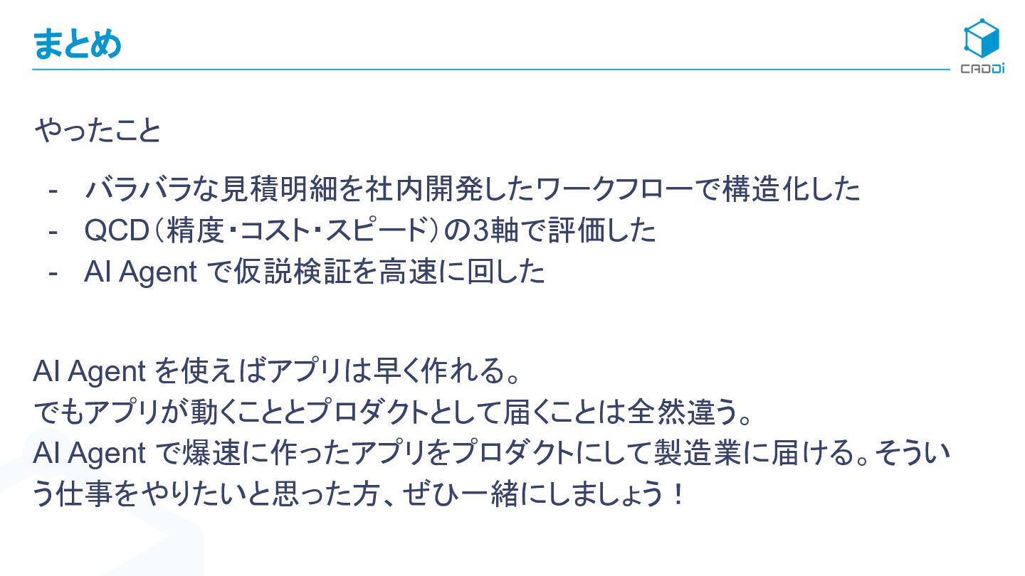 Agent を使えばアプリは早く作れる。 でもアプリが動くこととプロダクトとして届くことは全然違う。 AI Agent で爆速に作ったアプリをプロダクトにして製造業に届ける。そうい う仕事をやりたいと思った方、ぜひ一緒にしましょう! まとめ