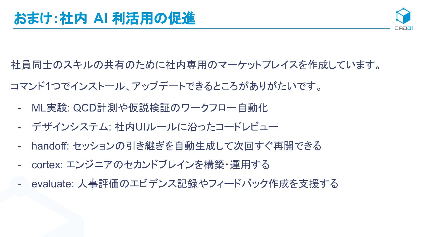 3. おまけ:社内 AI 利活用の促進 社員同士のスキルの共有のために社内専用のマーケットプレイスを作成しています。 コマンド1つでインストール、アップデートできるところがありがたいです。 - ML実験: QCD計測や仮説検証のワークフロー自動化 - デザインシステム: