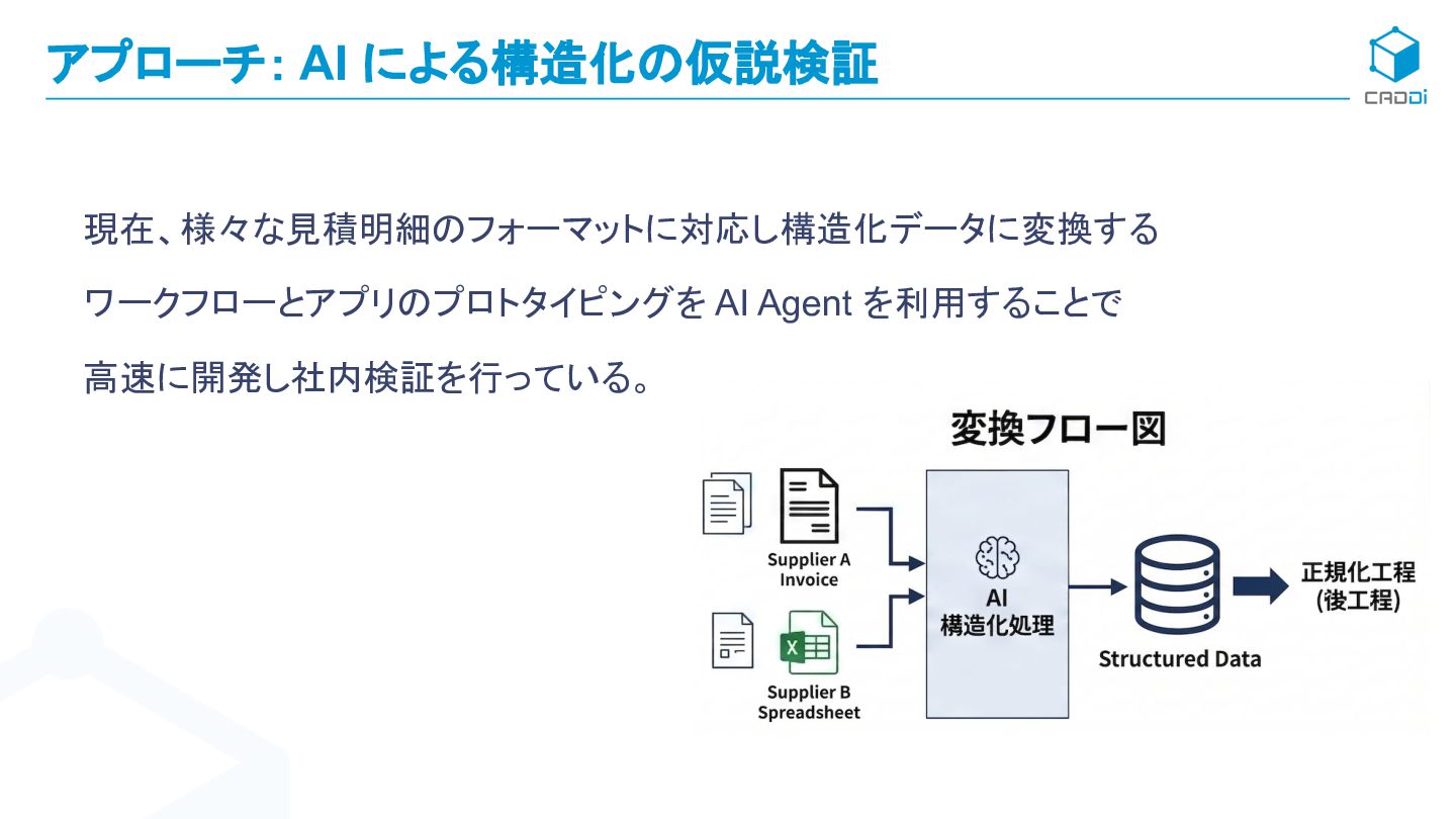 2. やったこと - バラバラな見積明細を社内開発したワークフローで構造化した - QCD(精度・コスト・スピード)の3軸で評価した - AI Agent で仮説検証を高速に回した AI