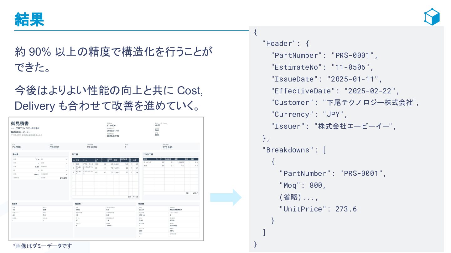 "Header": { "PartNumber": "PRS-0001", "EstimateNo": "11-0506", "IssueDate": "2025-01-11", "EffectiveDate": "2025-02-22", "Customer": "下尾テクノロジー株式会社 ", "Currency": "JPY", "Issuer": "株式会社エービーイー ", }, "Breakdowns": [ { "PartNumber": "PRS-0001", "Moq": 800, (省略)..., "UnitPrice": 273.6 } ] } *画像はダミーデータです