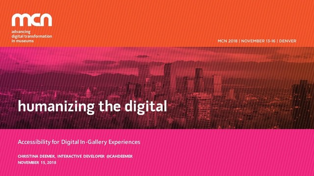 manager ‒ Performing arts & special collections libraries ‒ Raised ~$5M/year Retrained to become a web developer ‒ Certificate in web design & development from the University of the Arts 4 years as a developer at Interactive Mechanics ‒ Lead dev on several projects ‒ Co-created fellowship program ‒ Accessibility committee chair @cahdeemer #gallerya11y