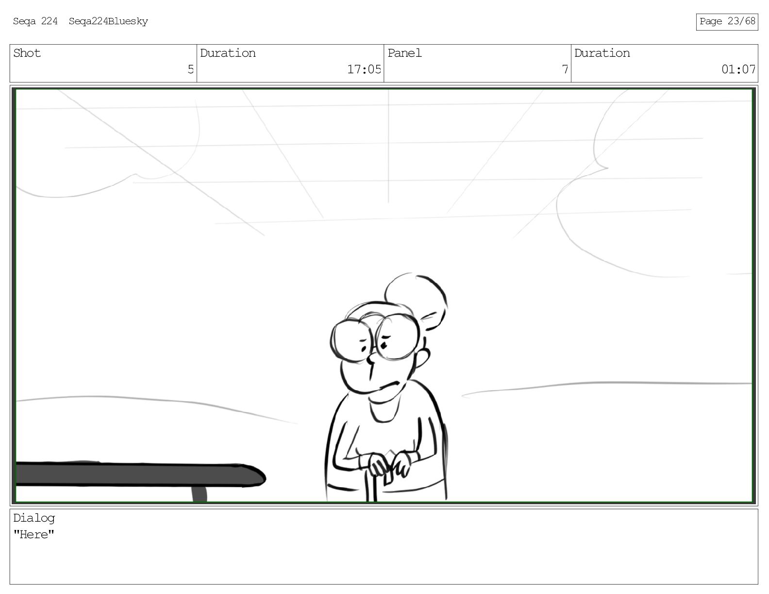 Shot 5 Duration 17:05 Panel 7 Duration 01:07 Dialog "Here"