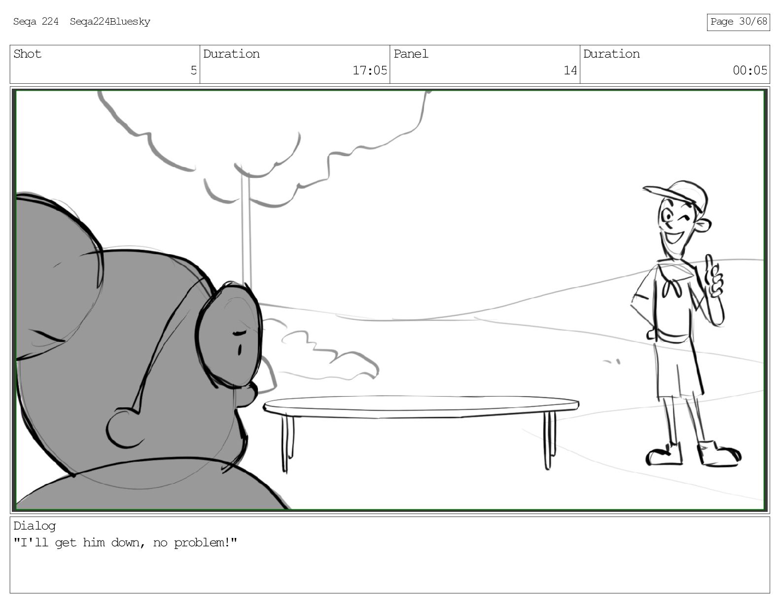 Shot 5 Duration 17:05 Panel 14 Duration 00:05 Dialog "I'll