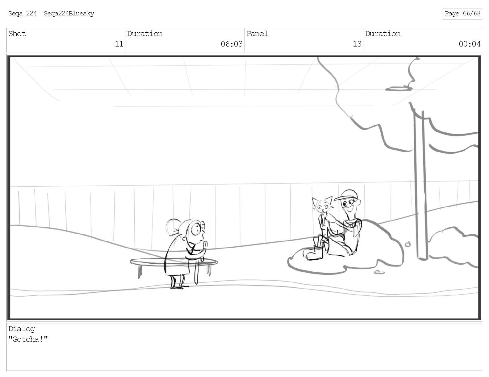 Shot 11 Duration 06:03 Panel 13 Duration 00:04 Dialog "Gotcha!"