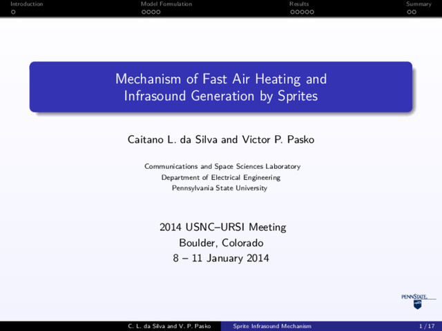 and Infrasound Generation by Sprites Caitano L. da Silva and Victor P. Pasko Communications and Space Sciences Laboratory Department of Electrical Engineering Pennsylvania State University 2014 USNC–URSI Meeting Boulder, Colorado 8 – 11 January 2014 C. L. da Silva and V. P. Pasko Sprite Infrasound Mechanism 1 / 17