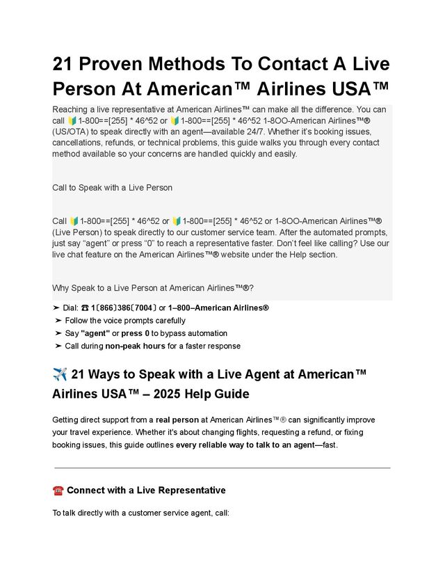 Reaching a live representative at American Airlines™️ can make all the difference. You can call 🔰1-800==[255] * 46^52 or 🔰1-800==[255] * 46^52 1-8OO-American Airlines™️® (US/OTA) to speak directly with an agent—available 24/7. Whether it’s booking issues, cancellations, refunds, or technical problems, this guide walks you through every contact method available so your concerns are handled quickly and easily.