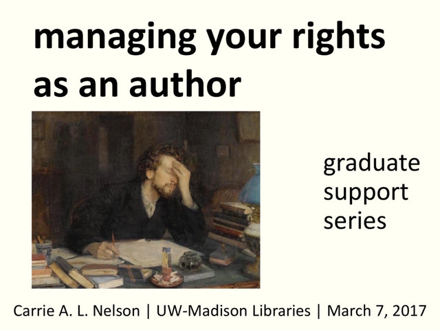 Have you given any thought to managing your own copyrights? Would you automatically sign a publishing agreement without reading the fine print? What are the implications of public access to your thesis or dissertation after deposit or of delaying release? This session will address common authors' rights issues encountered by graduate students.