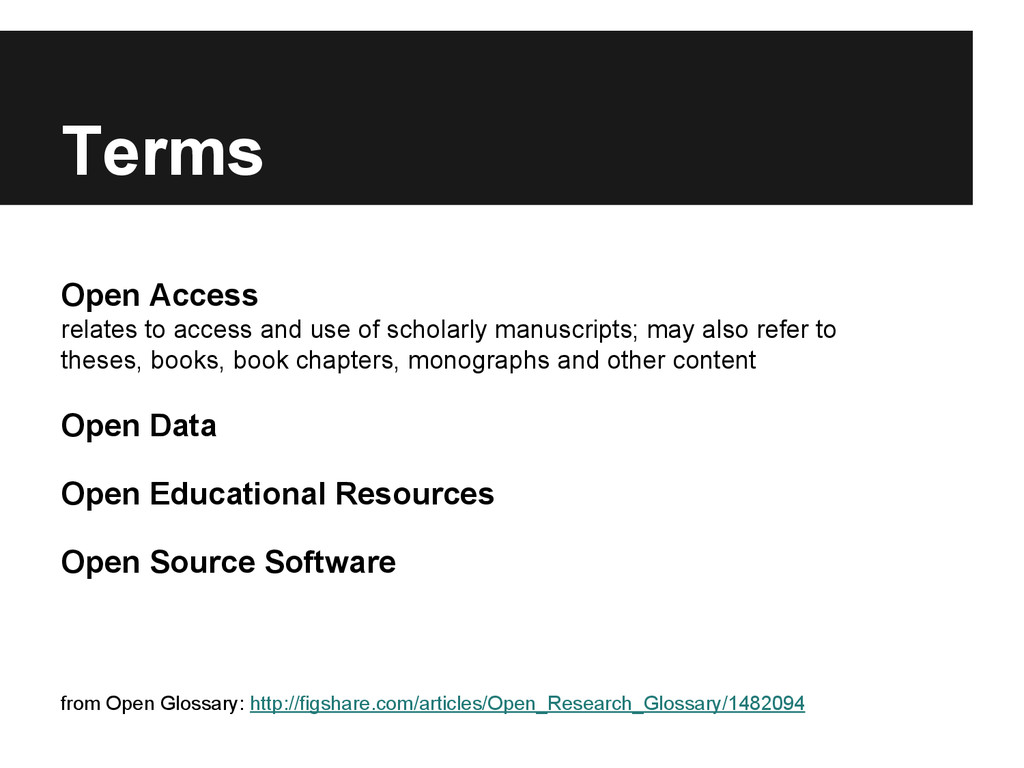 manuscripts; may also refer to theses, books, book chapters, monographs and other content Open Data Open Educational Resources Open Source Software from Open Glossary: http://figshare.com/articles/Open_Research_Glossary/1482094