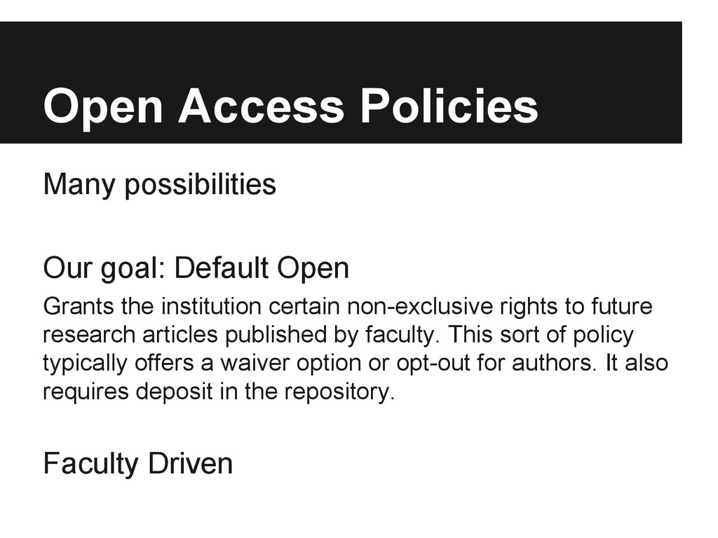 the institution certain non-exclusive rights to future research articles published by faculty. This sort of policy typically offers a waiver option or opt-out for authors. It also requires deposit in the repository. Faculty Driven