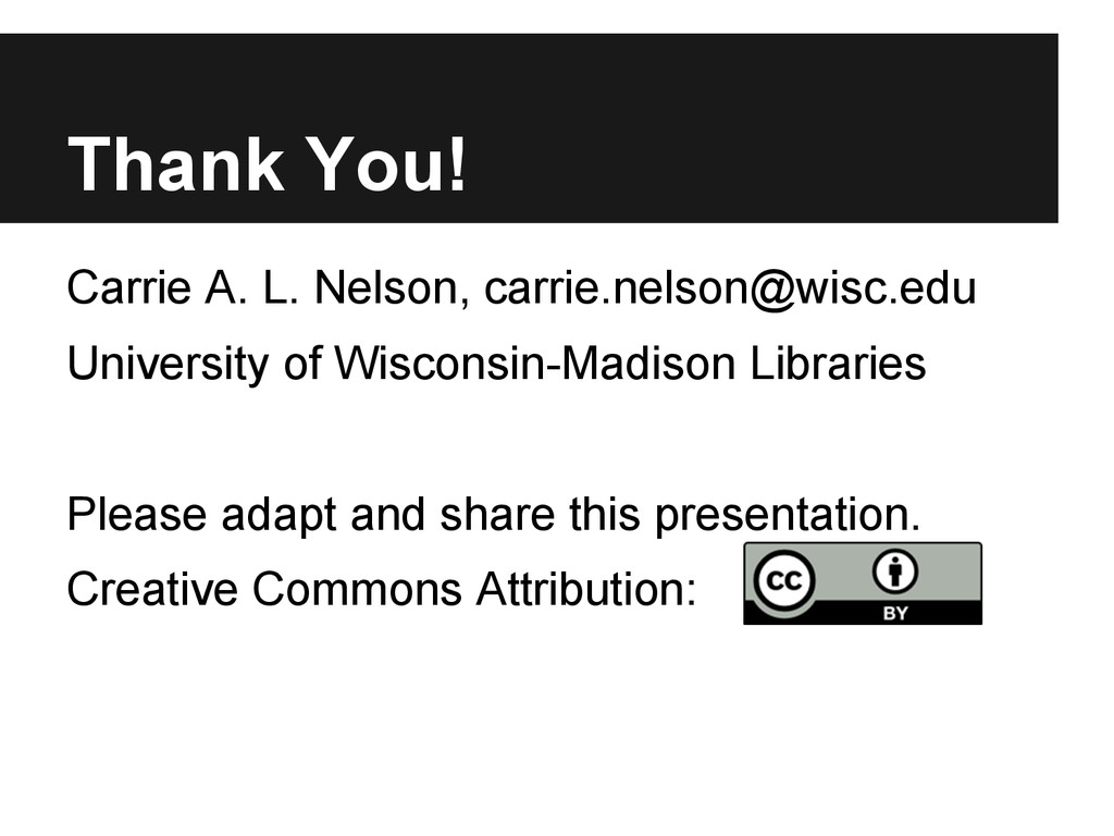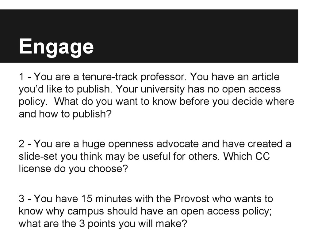 an article you’d like to publish. Your university has no open access policy. What do you want to know before you decide where and how to publish? 2 - You are a huge openness advocate and have created a slide-set you think may be useful for others. Which CC license do you choose? 3 - You have 15 minutes with the Provost who wants to know why campus should have an open access policy; what are the 3 points you will make?