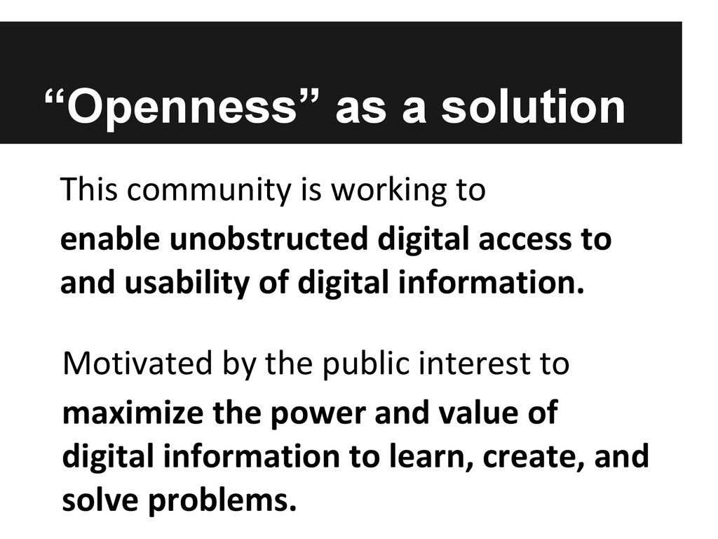 and usability of digital information. “Openness” as a solution Motivated by the public interest to maximize the power and value of digital information to learn, create, and solve problems.
