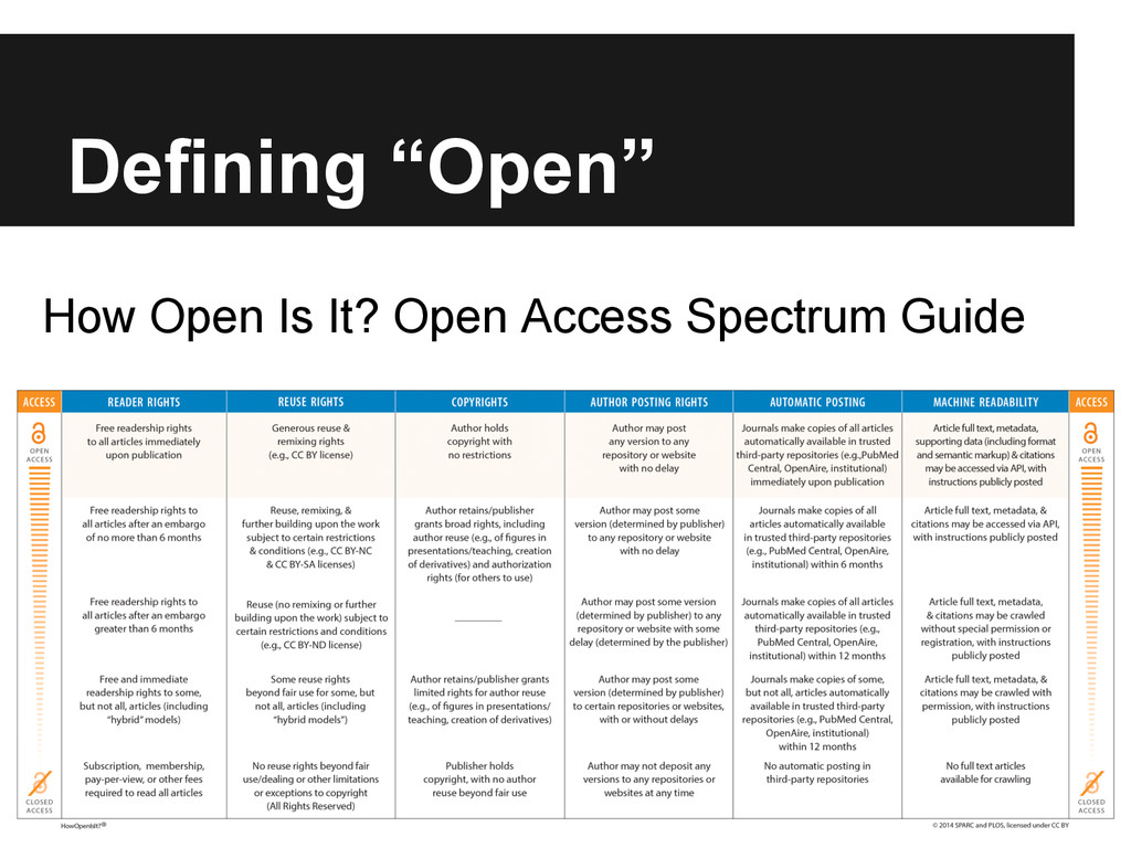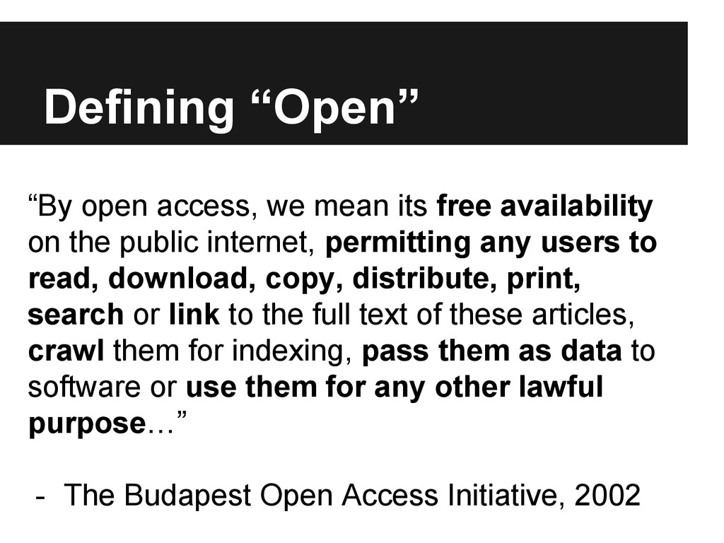 on the public internet, permitting any users to read, download, copy, distribute, print, search or link to the full text of these articles, crawl them for indexing, pass them as data to software or use them for any other lawful purpose…” - The Budapest Open Access Initiative, 2002