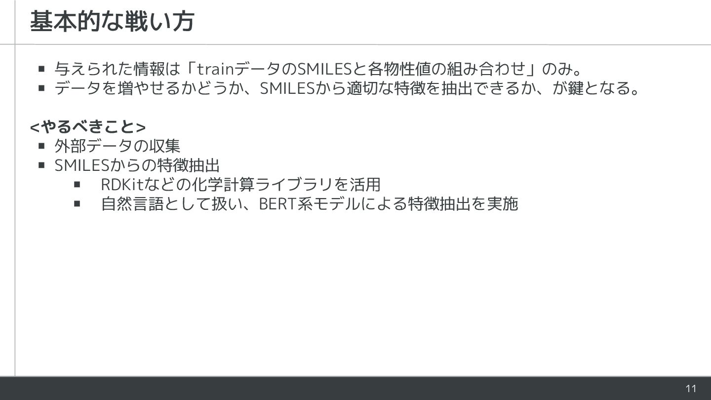 11 ▪ 与えられた情報は「trainデータのSMILESと各物性値の組み合わせ」のみ。 ▪ データを増やせるかどうか、SMILESから適切な特徴を抽出できるか、が鍵となる。 <やるべきこと> ▪ 外部データの収集 ▪ SMILESからの特徴抽出