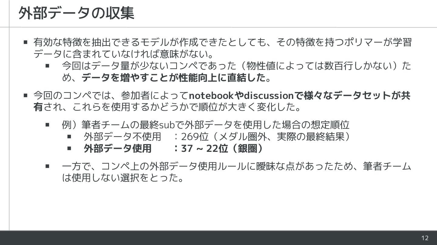 12 ▪ 有効な特徴を抽出できるモデルが作成できたとしても、その特徴を持つポリマーが学習 データに含まれていなければ意味がない。 ▪ 今回はデータ量が少ないコンペであった(物性値によっては数百行しかない)た め、データを増やすことが性能向上に直結した。 ▪ 今回のコンペでは、参加者によってnotebookやdiscussionで様々なデータセットが共 有され、これらを使用するかどうかで順位が大きく変化した。