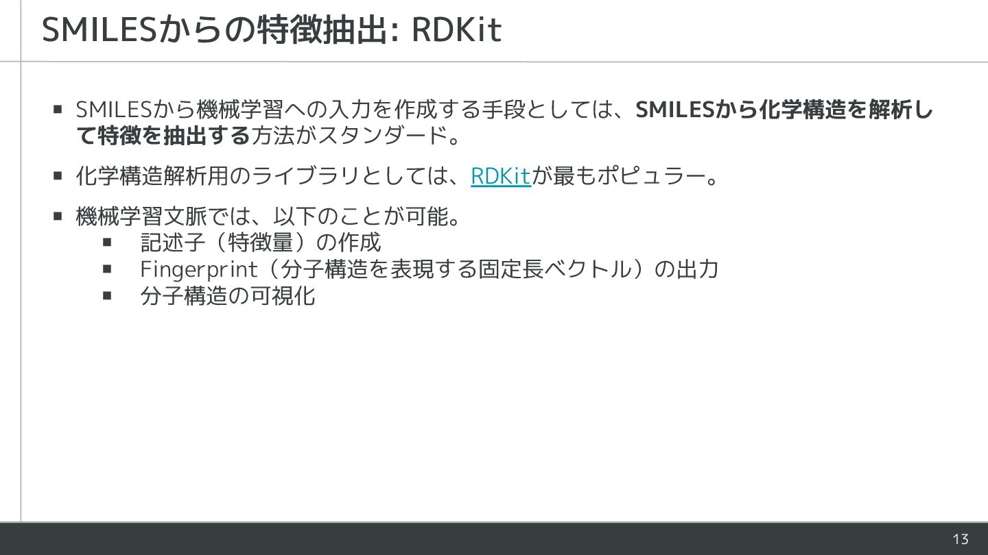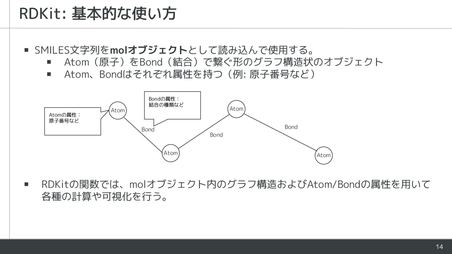 13 ▪ SMILESから機械学習への入力を作成する手段としては、SMILESから化学構造を解析し て特徴を抽出する方法がスタンダード。 ▪ 化学構造解析用のライブラリとしては、RDKitが最もポピュラー。 ▪ 機械学習文脈では、以下のことが可能。 ▪ 記述子(特徴量)の作成
