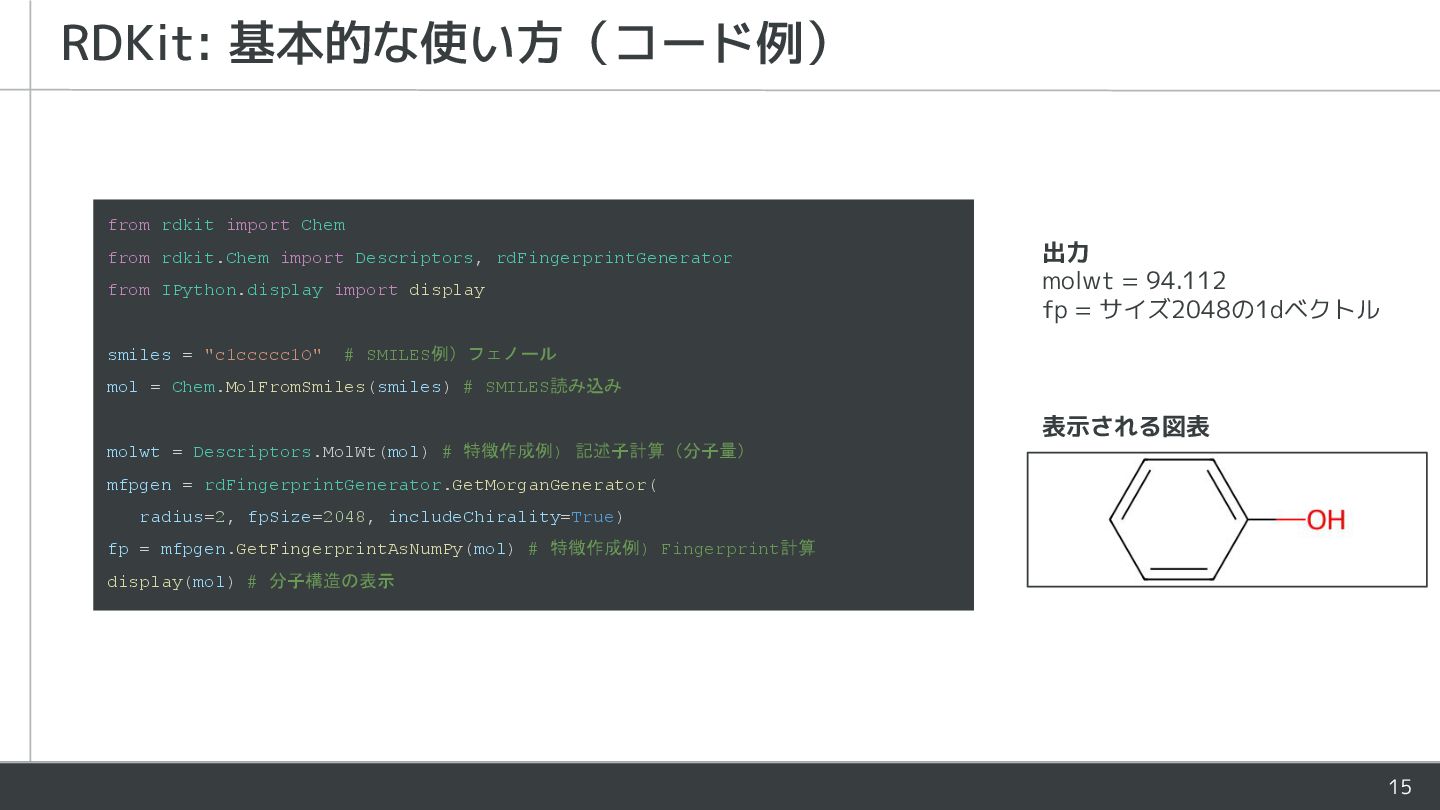 15 RDKit: 基本的な使い方(コード例) from rdkit import Chem from rdkit.Chem import