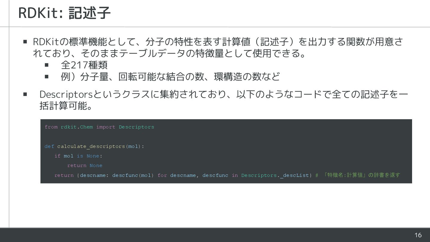 括計算可能。 RDKit: 記述子 from rdkit.Chem import Descriptors def calculate_descriptors(mol): if mol is None: return None return {descname: descfunc(mol) for descname, descfunc in Descriptors._descList} # 「特徴名:計算値」の辞書を返す
