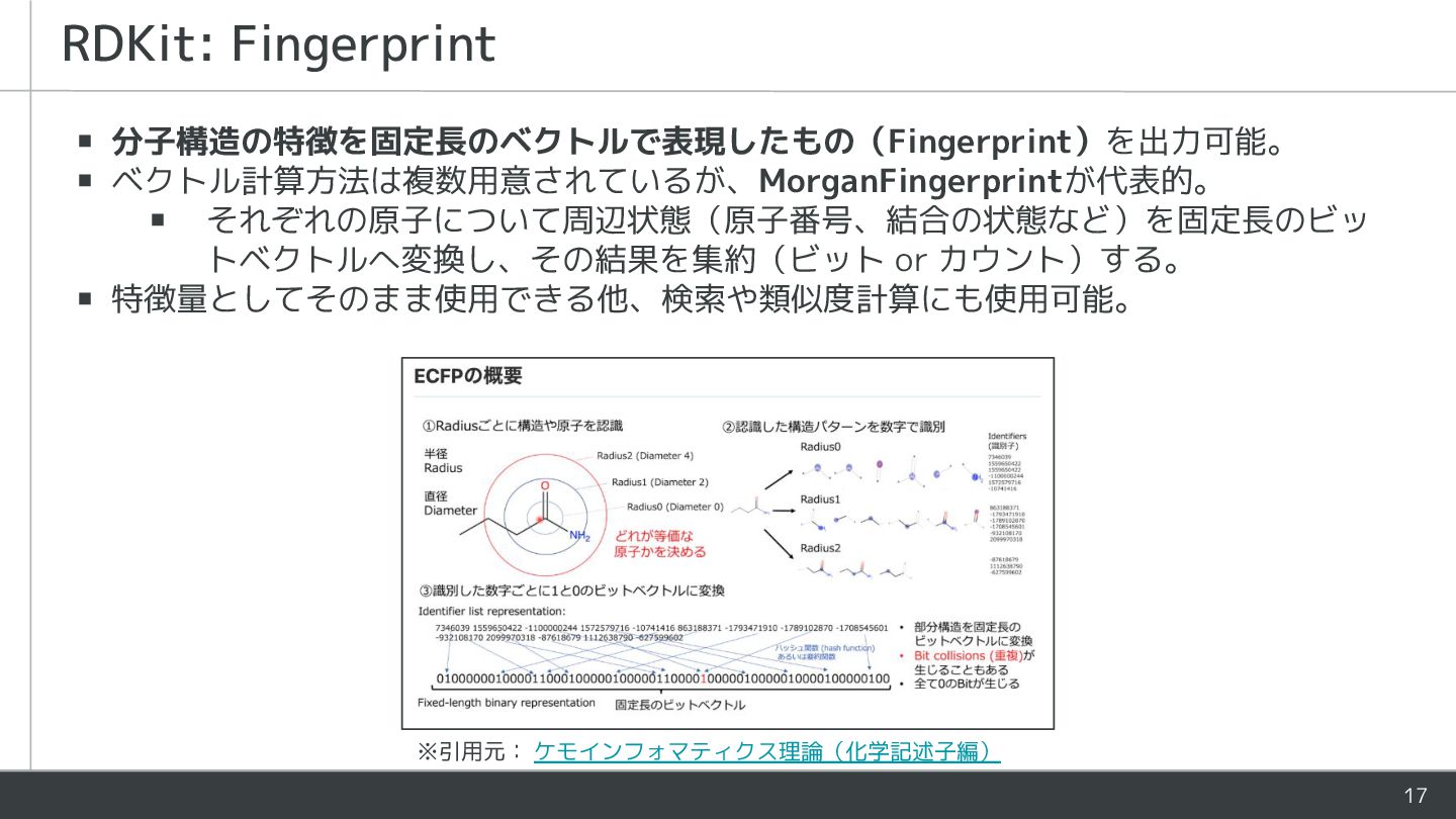 17 ▪ 分子構造の特徴を固定長のベクトルで表現したもの(Fingerprint)を出力可能。 ▪ ベクトル計算方法は複数用意されているが、MorganFingerprintが代表的。 ▪ それぞれの原子について周辺状態(原子番号、結合の状態など)を固定長のビッ トベクトルへ変換し、その結果を集約(ビット or カウント)する。